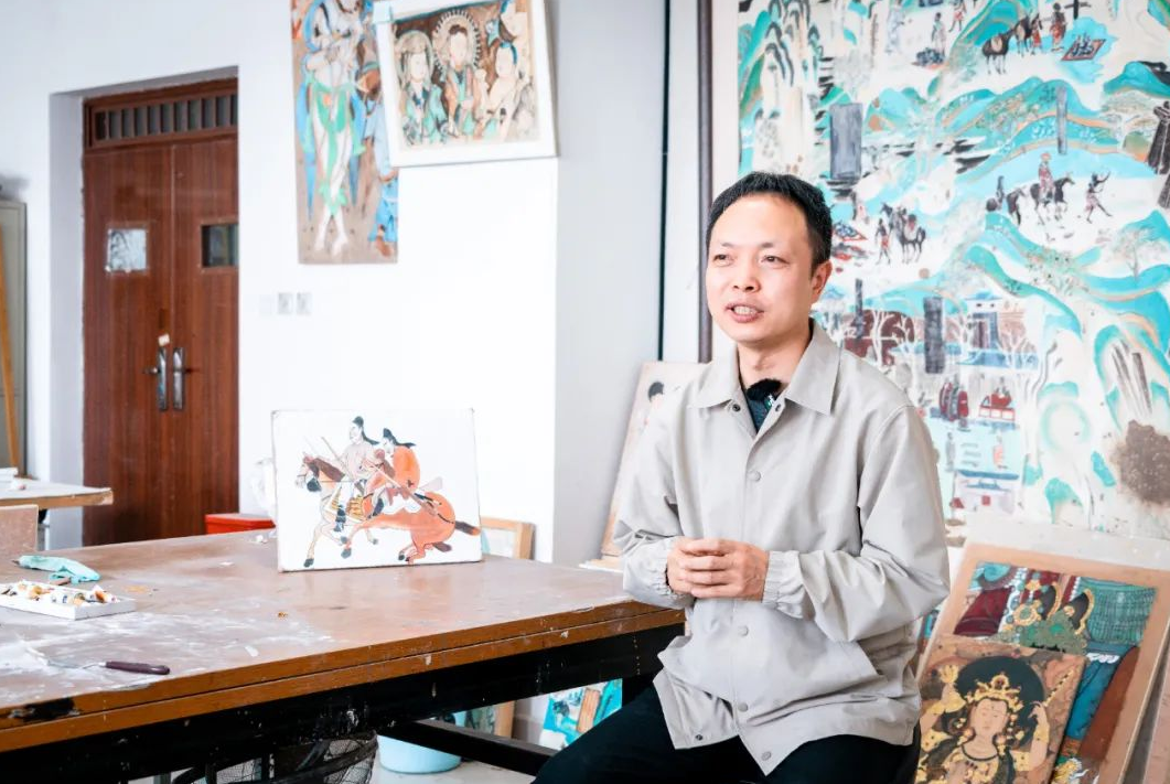 左手抚画,选取色彩;右手持笔,描绘线条,双手舞动之间,汉唐壁画仿佛穿越时空,展现在眼前……