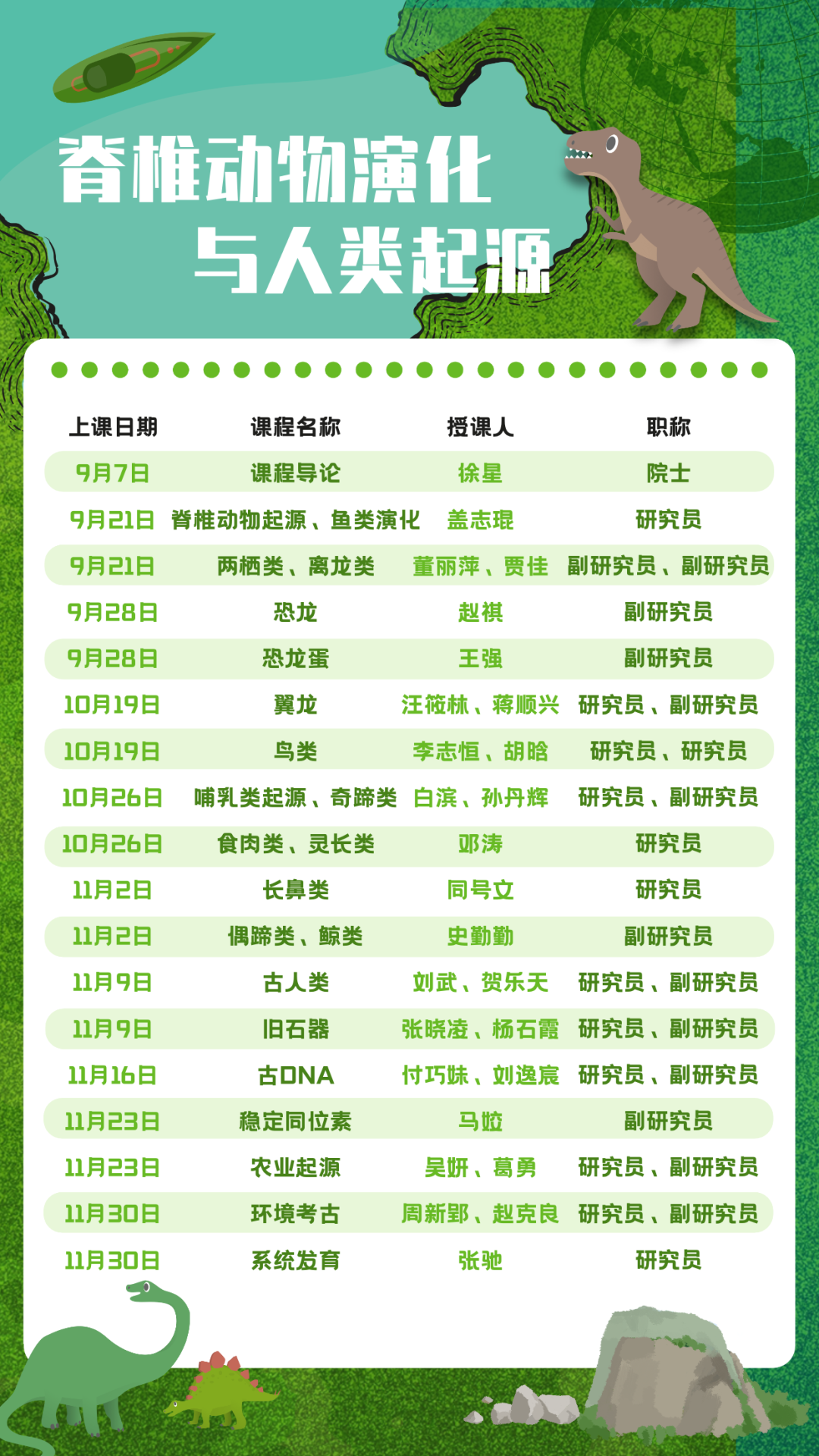 徐星院士首讲拉开这门课程的大幕之后,2024年秋季学期,邓涛、付巧妹、汪筱林等知名学者和一批青年骨干,将陆续来到开云网页版登录入口,分别讲授“脊椎动物起源与鱼类演化”“两栖类、离龙类动物”“哺乳类动物起源”“食肉类、灵长类动物”“古人类”“古DNA”“农业起源”“环境考古”“系统发育”等课程。课程的设计是“将脊椎动物的进化置于整个地质历史的框架中予以讲解,让学生对生命演化的复杂性以及地球环境的长期演变有更深的认识。”授课专家全部来自中国科学院古脊椎所,他们在各自研究的领域均拥有丰富的教学经验和科研成果,这样的“豪华阵容”能够确保让本科生接触到当今古生物学界最前沿的研究成果。