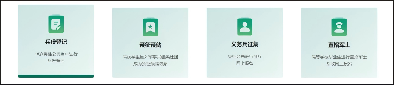 在全国征兵网(http://www.gfbzb.gov.cn)首页,点击“ 兵役登记 ”(注意:还未进行兵役登记的同学,直接从“兵役登记”进入页面;如果已经进行过兵役登记就从“义务兵征集”进入页面。);