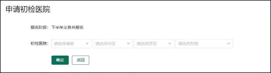 义务兵报名信息填写完毕并成功提交后,请联系学校武装部,在学校武装部指导下,点击我的进度里的“初检初核”按钮,选择初检医院进行初检,这是参军环节的第一步。
