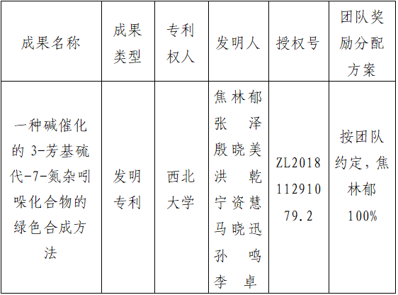 按照《开云网页版登录入口促进科技成果转化实施办法》(西大科〔2019〕5号)相关规定,拟对我校化工学院焦林郁教授作为成果负责人的1项发明专利权实施转化,现将相关信息公示如下: