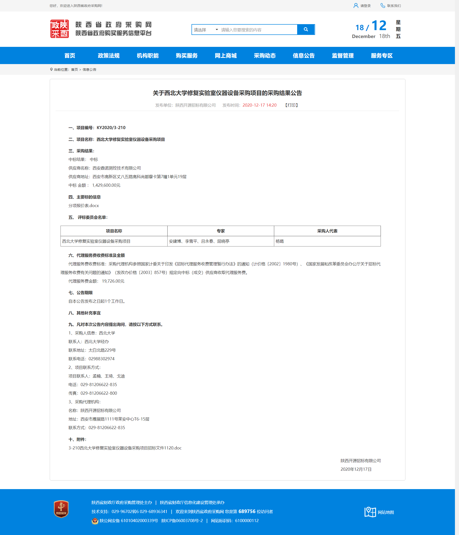 关于开云网页版登录入口修复实验室仪器设备采购项目的采购结果公告 作者: 编辑:薛利娟 时间:2020-12-18 原公告地址:http://www.ccgp-shaanxi.gov.cn/notice/noticeDetail.do?noticeguid=8a85be34765f9eac01766f3cbcd749f6
