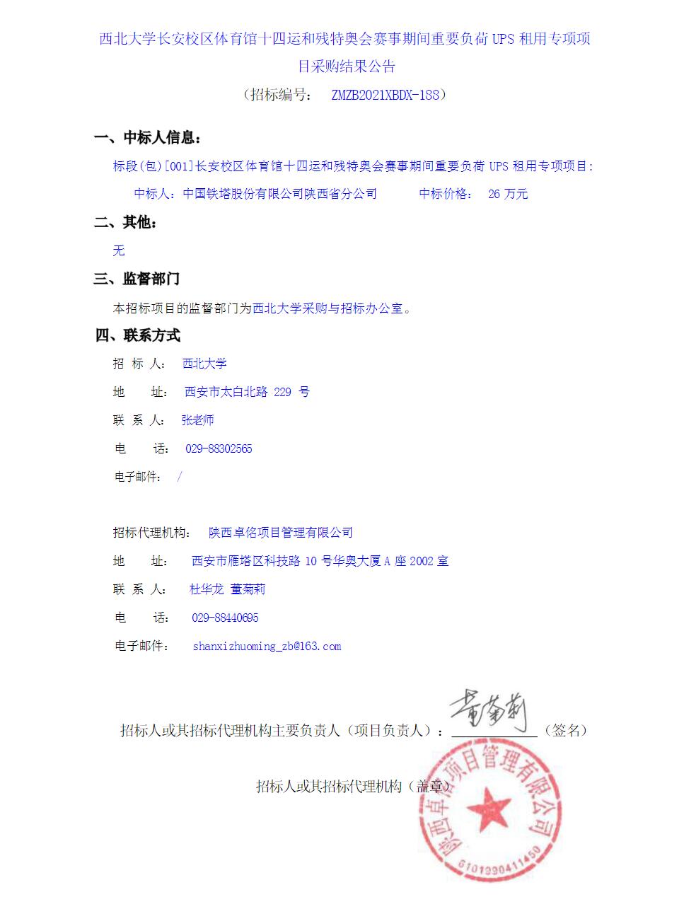 关于开云网页版登录入口长安校区体育馆十四运和残特奥会赛事期间重要负荷UPS租用专项项目采购结果公告