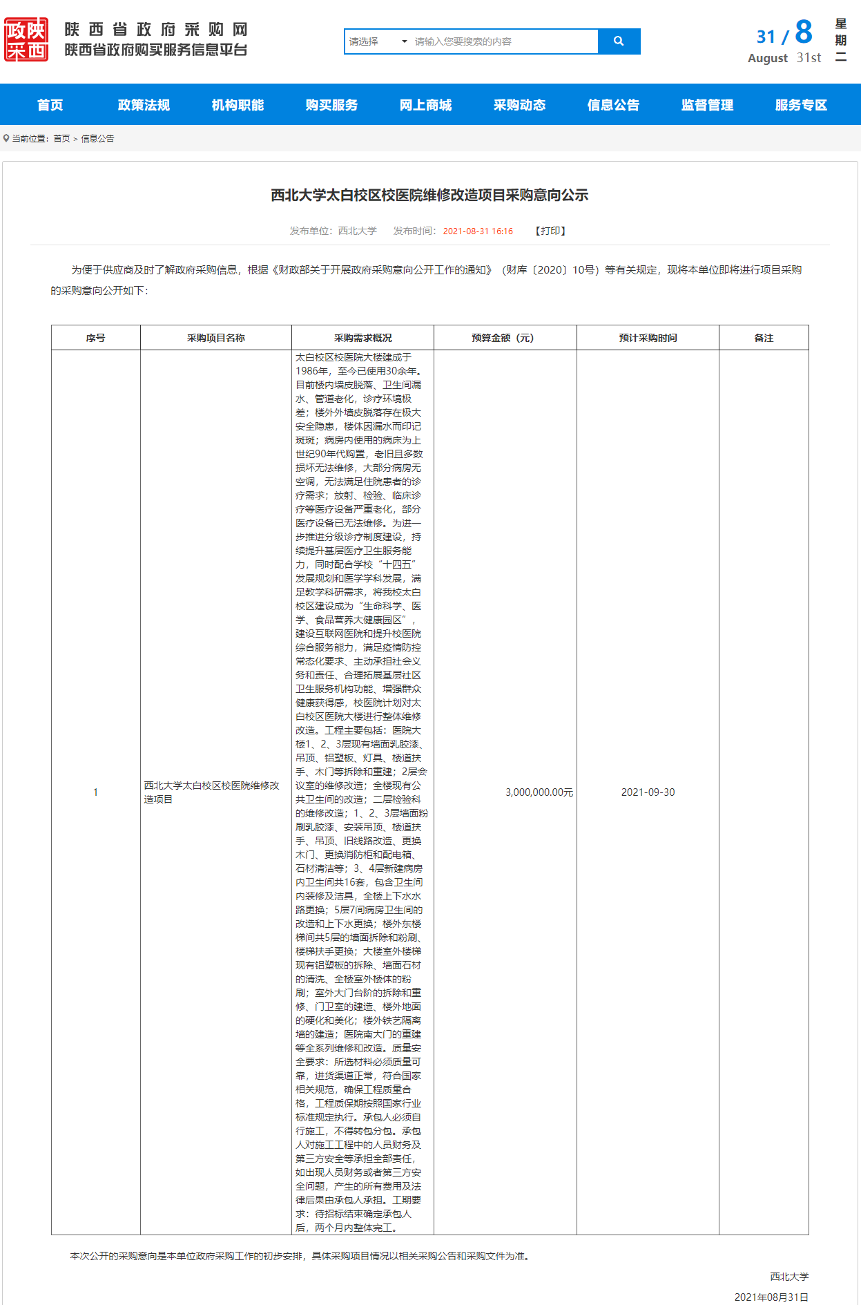 开云网页版登录入口太白校区校医院维修改造项目采购意向公示