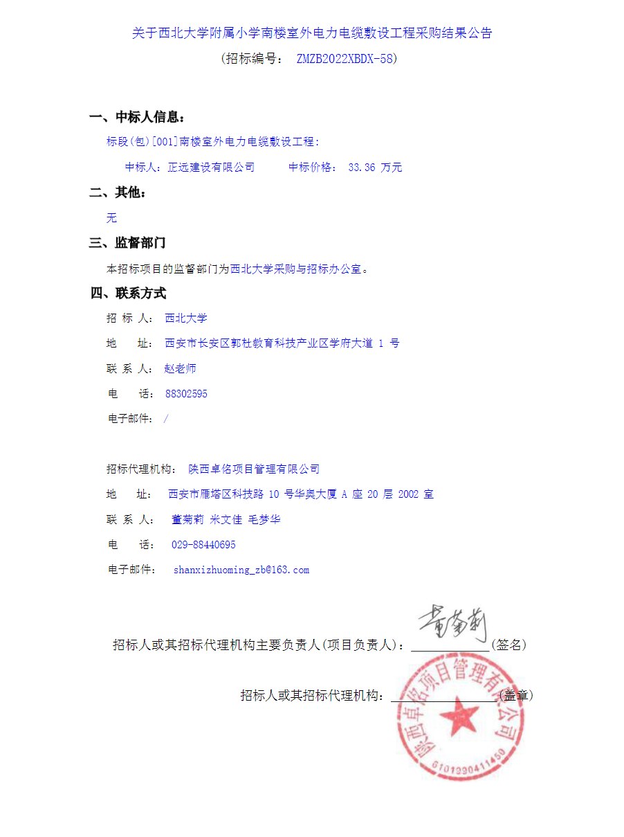 关于开云网页版登录入口附属小学南楼室外电力电缆敷设工程采购结果公告