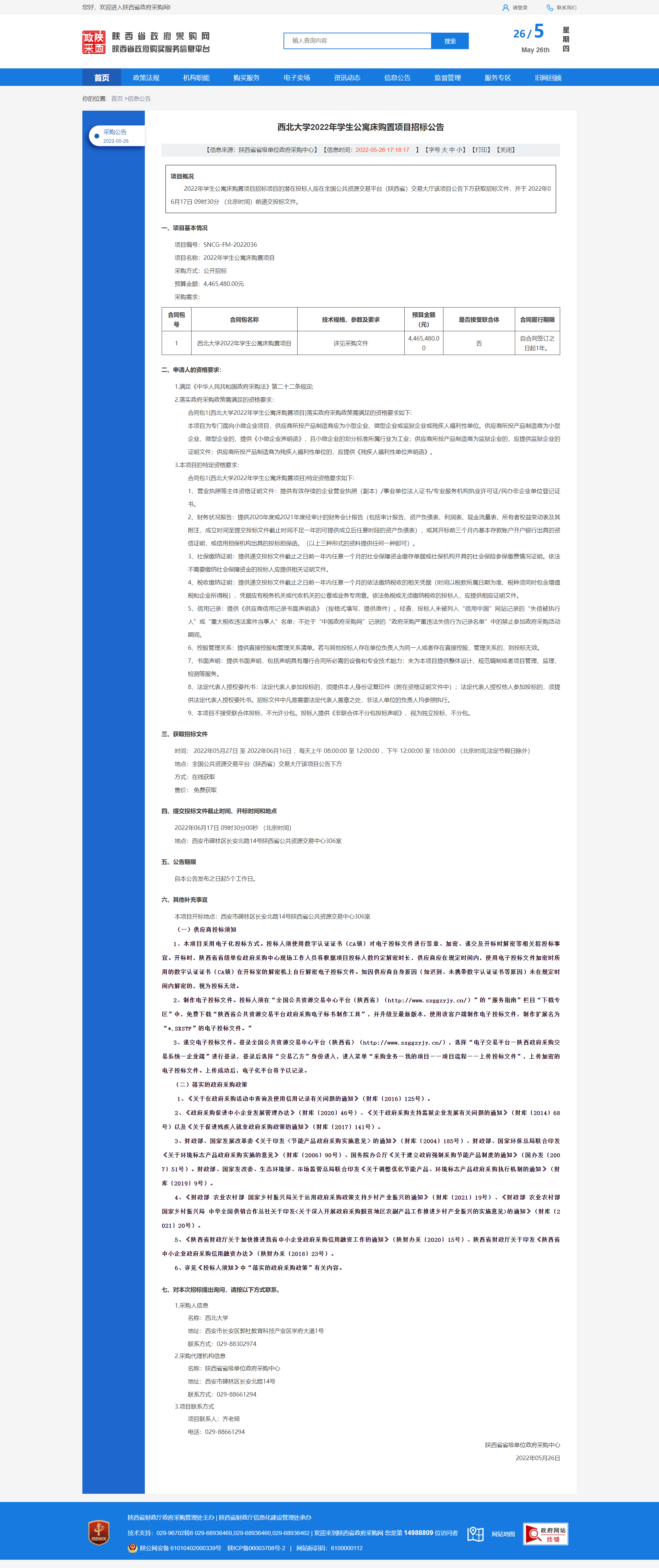 开云网页版登录入口2022年学生公寓床购置项目招标公告 作者: 编辑:薛利娟 时间:2022-05-26 原公告链接:http://www.ccgp-shaanxi.gov.cn/freecms/site/shaanxi/ggxx/info/2022/8a69c34a80cf8c1d0180d6127e5a14f4.html?noticeType=001011¬iceId=0697247a-dcd5-11ec-9a8e-08c0eb20c666
