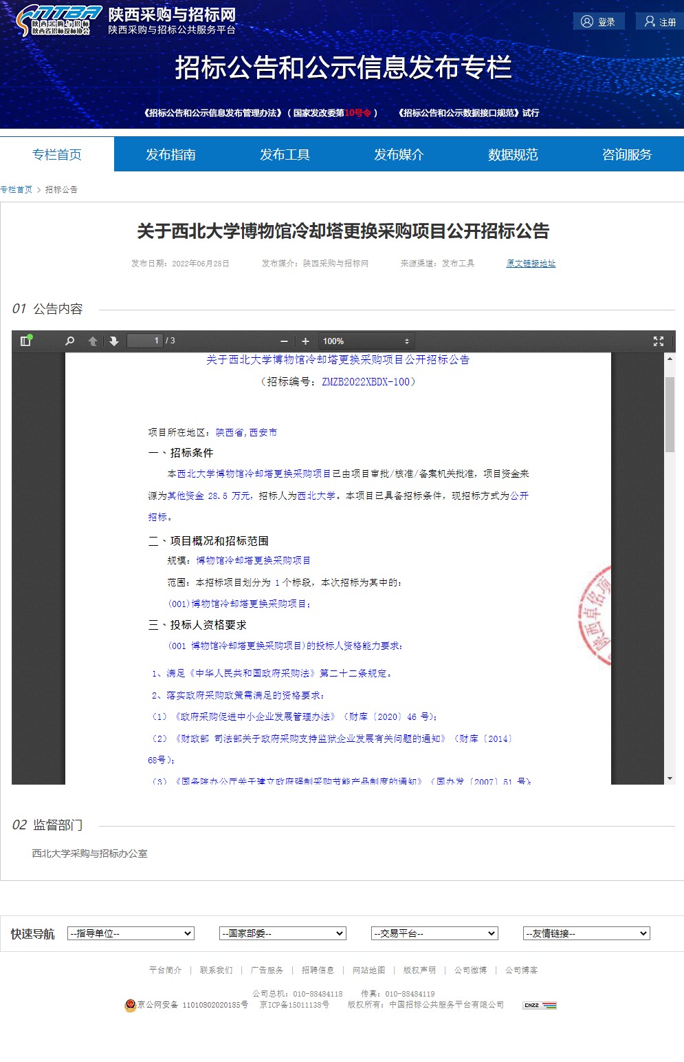 关于开云网页版登录入口博物馆冷却塔更换采购项目公开招标公告 作者: 编辑:采购与招标办公室 时间:2022-06-28 原公告链接:http://bulletin.sntba.com/biddingBulletin/2022-06-28/439809.html