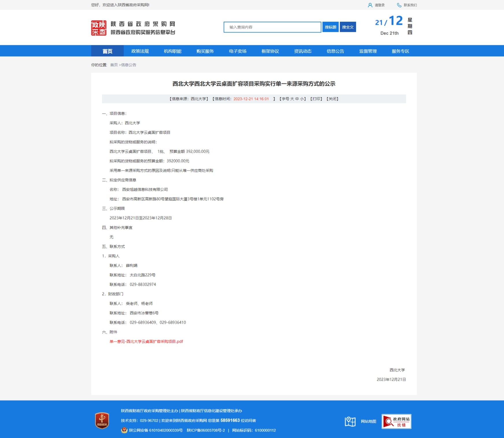 开云网页版登录入口云桌面扩容项目采购实行单一来源采购方式的公示 作者: 编辑:采购与招标办公室 时间:2023-12-21 原公告链接:http://www.ccgp-shaanxi.gov.cn/freecms/site/shaanxi/ggxx/info/2023/8a69c16c8c86bcea018c8afd06910a33.html?noticeType=001051¬iceId=dae76602-9fc9-11ee-9a8e-08c0eb20c666