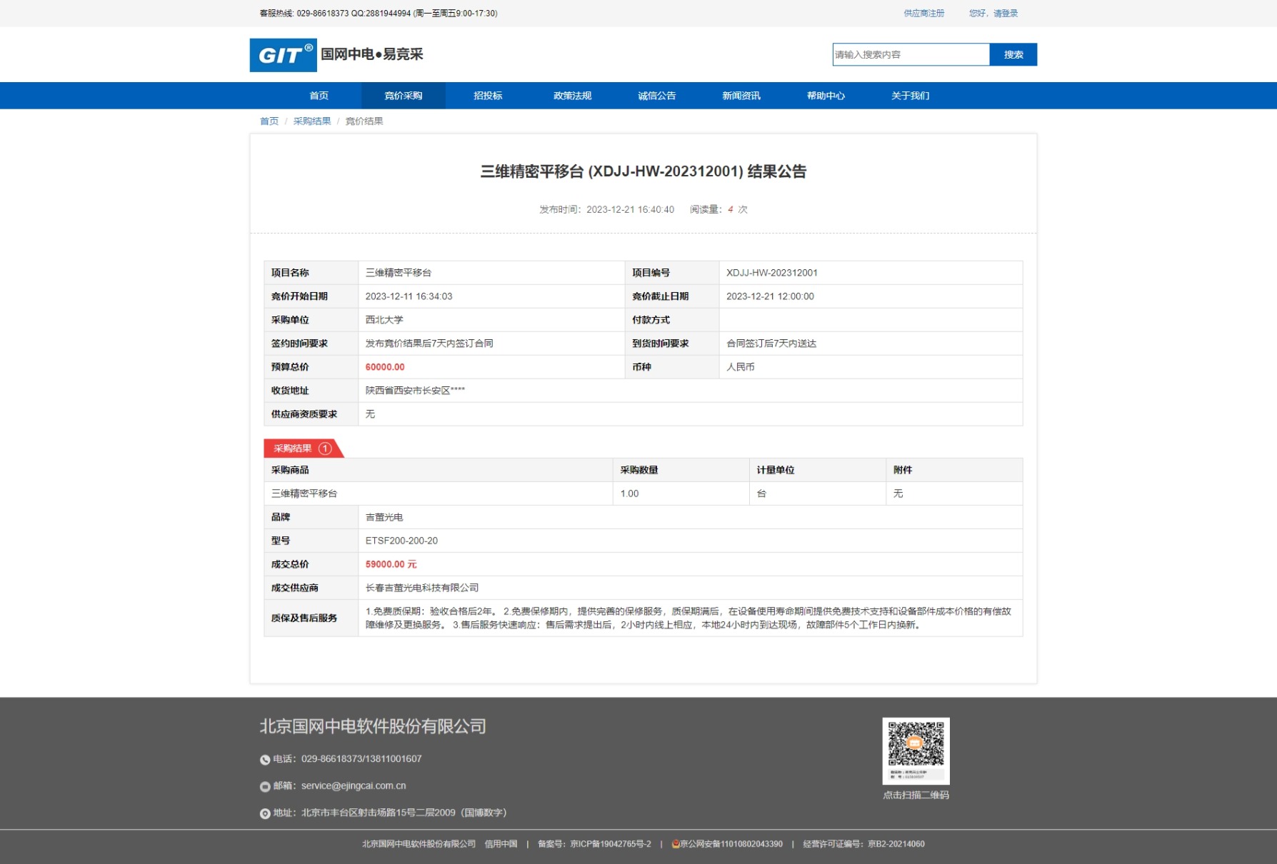 开云网页版登录入口三维精密平移台采购项目 (XDJJ-HW-202312001) 竞价结果公告 作者: 编辑: 时间:2023-12-21 原公告链接:http://www.ejingcai.com.cn/site/bidding/detail/7978