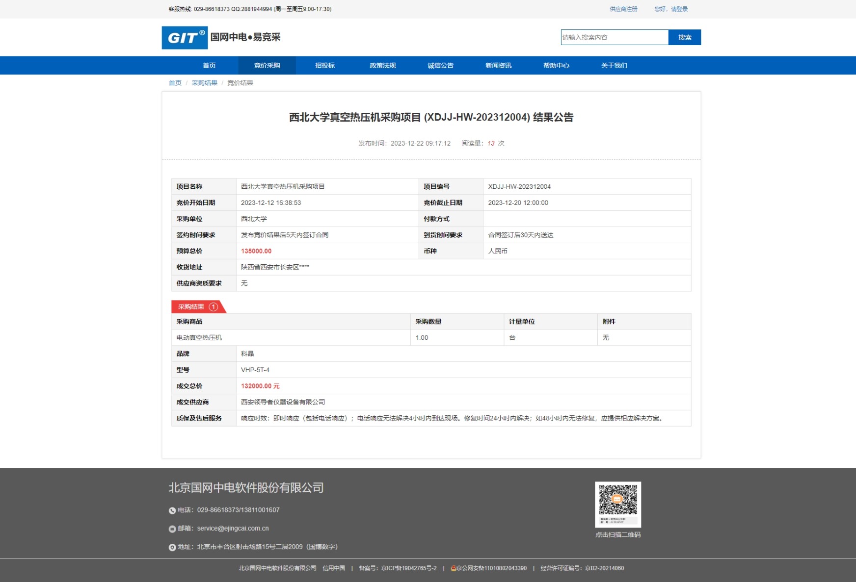 开云网页版登录入口真空热压机采购项目 (XDJJ-HW-202312004) 竞价结果公告 作者: 编辑:采购与招标办公室 时间:2023-12-22 原公告链接:https://www.ejingcai.com.cn/site/bidding/detail/7982