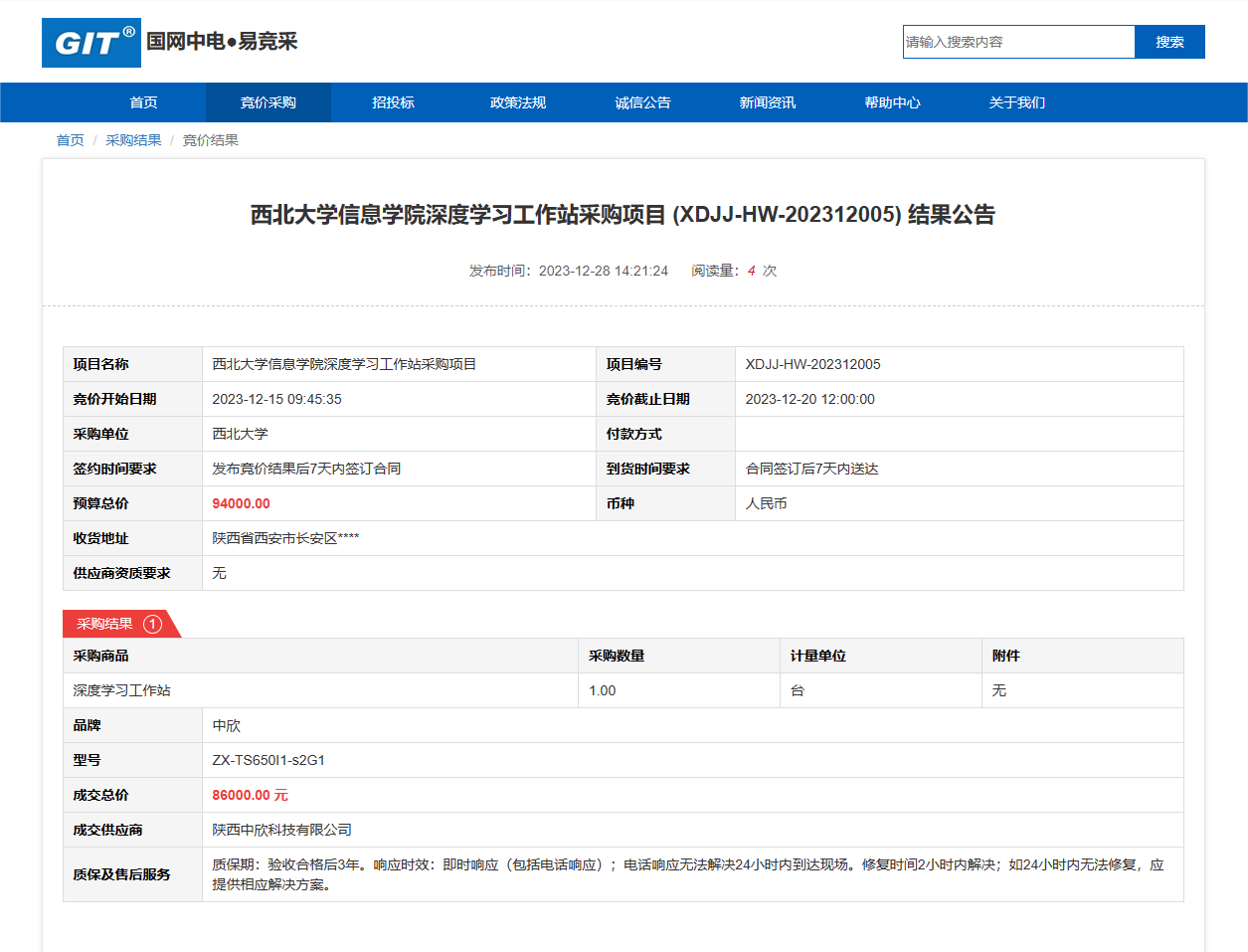 开云网页版登录入口信息学院深度学习工作站采购项目 (XDJJ-HW-202312005) 竞价结果公告 作者: 编辑:采购与招标办公室 时间:2023-12-28 原公告链接:https://www.ejingcai.com.cn/site/bidding/detail/8075