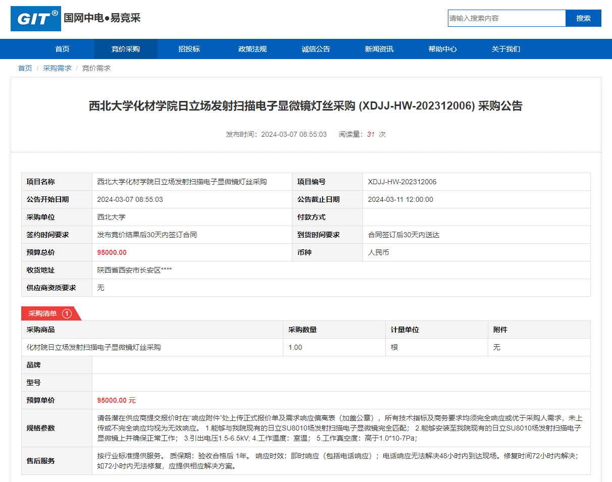 开云网页版登录入口化材学院日立场发射扫描电子显微镜灯丝采购 (XDJJ-HW-202312006)竞价公告 作者: 编辑: 时间:2024-03-07 原公告链接:https://www.ejingcai.com.cn/site/bidding/detail/8741