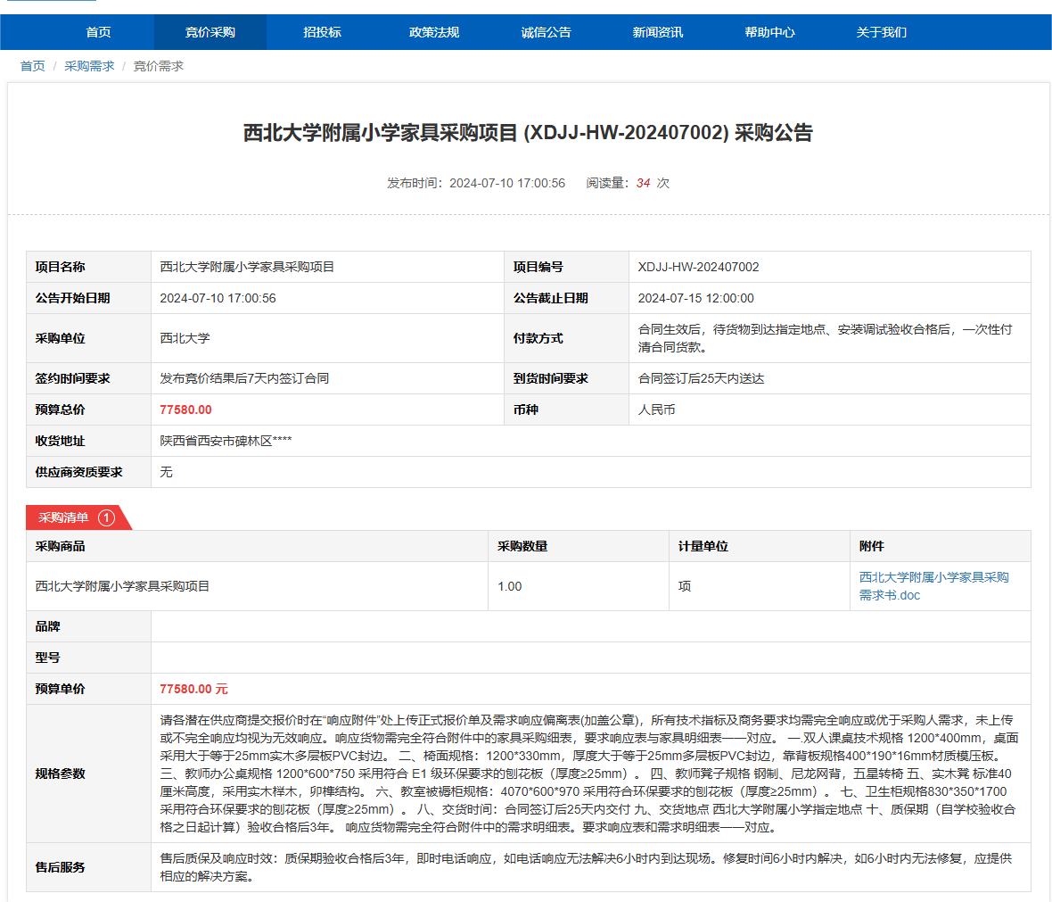 开云网页版登录入口附属小学家具采购项目 (XDJJ-HW-202407002) 竞价采购公告 作者: 编辑: 时间:2024-07-11 原公告链接:https://www.ejingcai.com.cn/site/bidding/detail/11607