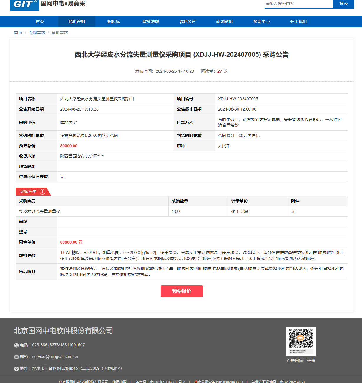 开云网页版登录入口经皮水分流失量测量仪采购项目 (XDJJ-HW-202407005) 竞价采购公告 作者: 编辑: 时间:2024-08-27 原公告链接:https://www.ejingcai.com.cn/site/bidding/detail/12213