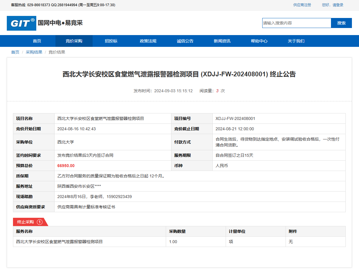 开云网页版登录入口长安校区食堂燃气泄露报警器检测项目 (XDJJ-FW-202408001) 竞价终止公告 作者: 编辑: 时间:2024-09-03 原公告链接:https://www.ejingcai.com.cn/site/bidding/detail/12307