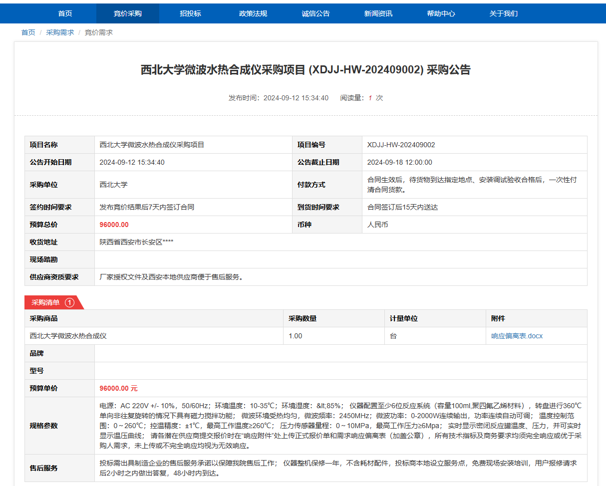开云网页版登录入口微波水热合成仪采购项目 (XDJJ-HW-202409002)竞价采购公告 作者: 编辑: 时间:2024-09-12 原公告链接:https://www.ejingcai.com.cn/site/bidding/detail/12527