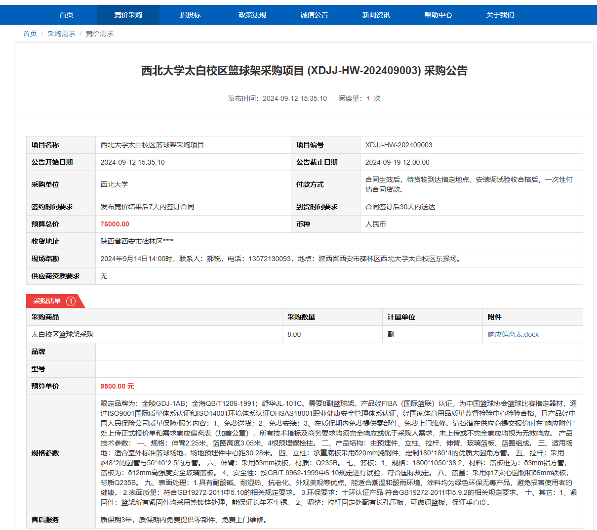 开云网页版登录入口太白校区篮球架采购项目 (XDJJ-HW-202409003)竞价采购公告 作者: 编辑: 时间:2024-09-12 原公告链接:https://www.ejingcai.com.cn/site/bidding/detail/12528