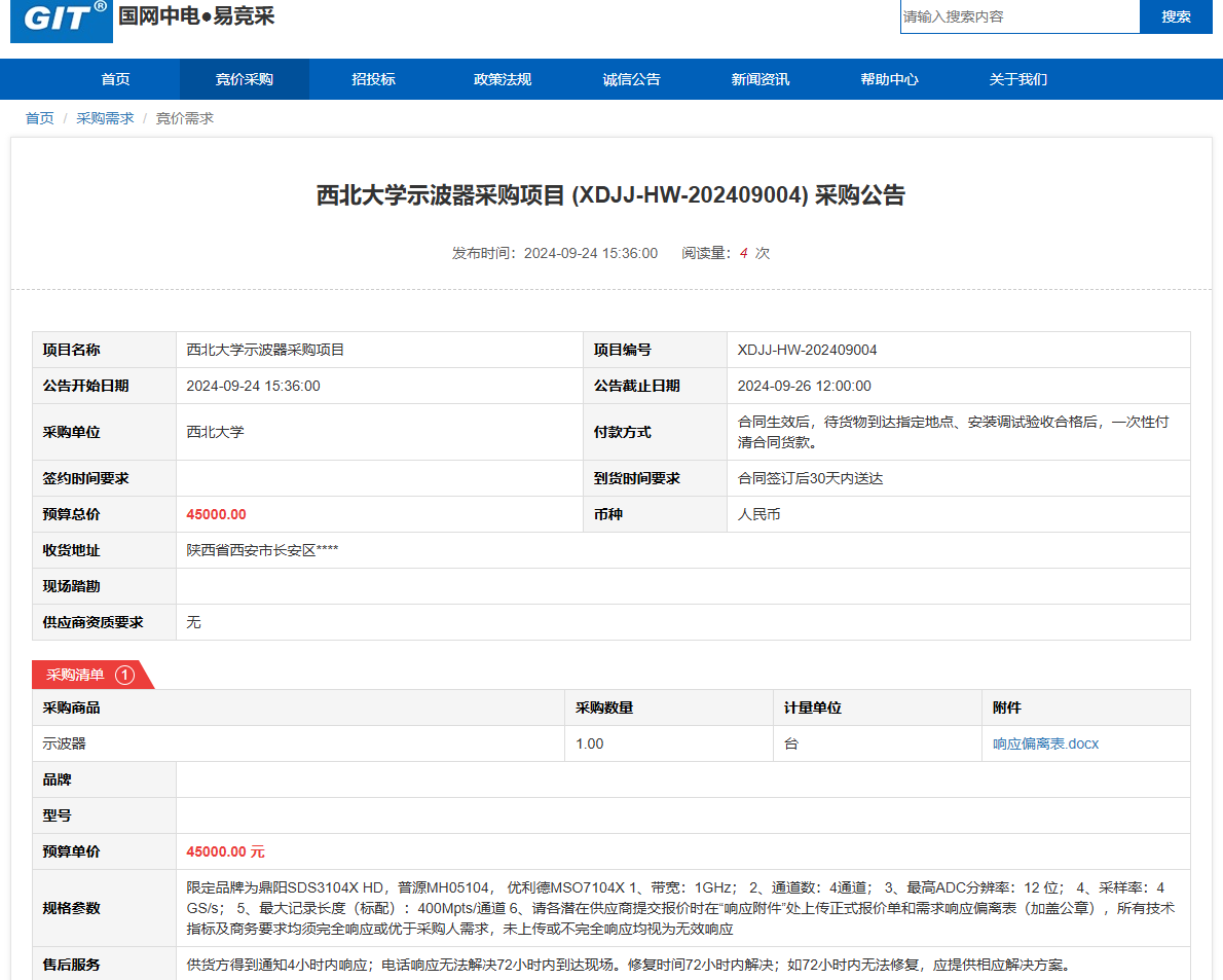 开云网页版登录入口示波器采购项目 (XDJJ-HW-202409004)竞价采购公告 作者: 编辑: 时间:2024-09-24 原公告链接:https://www.ejingcai.com.cn/site/bidding/detail/12860