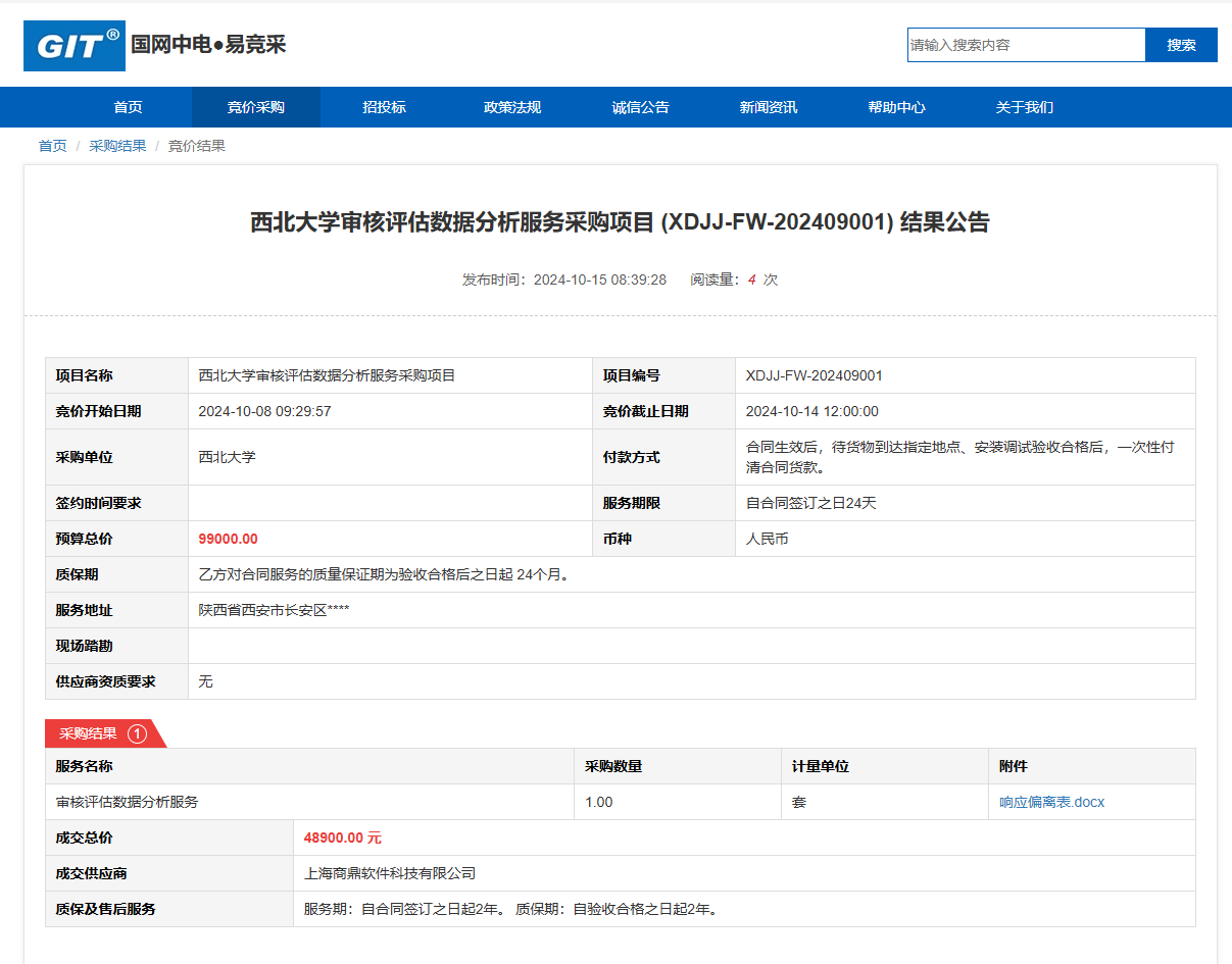 开云网页版登录入口审核评估数据分析服务采购项目(XDJJ-FW-202409001)竞价结果公告 作者:采购与招标办公室 编辑: 时间:2024-10-15 原公告链接:https://www.ejingcai.com.cn/site/bidding/detail/13296