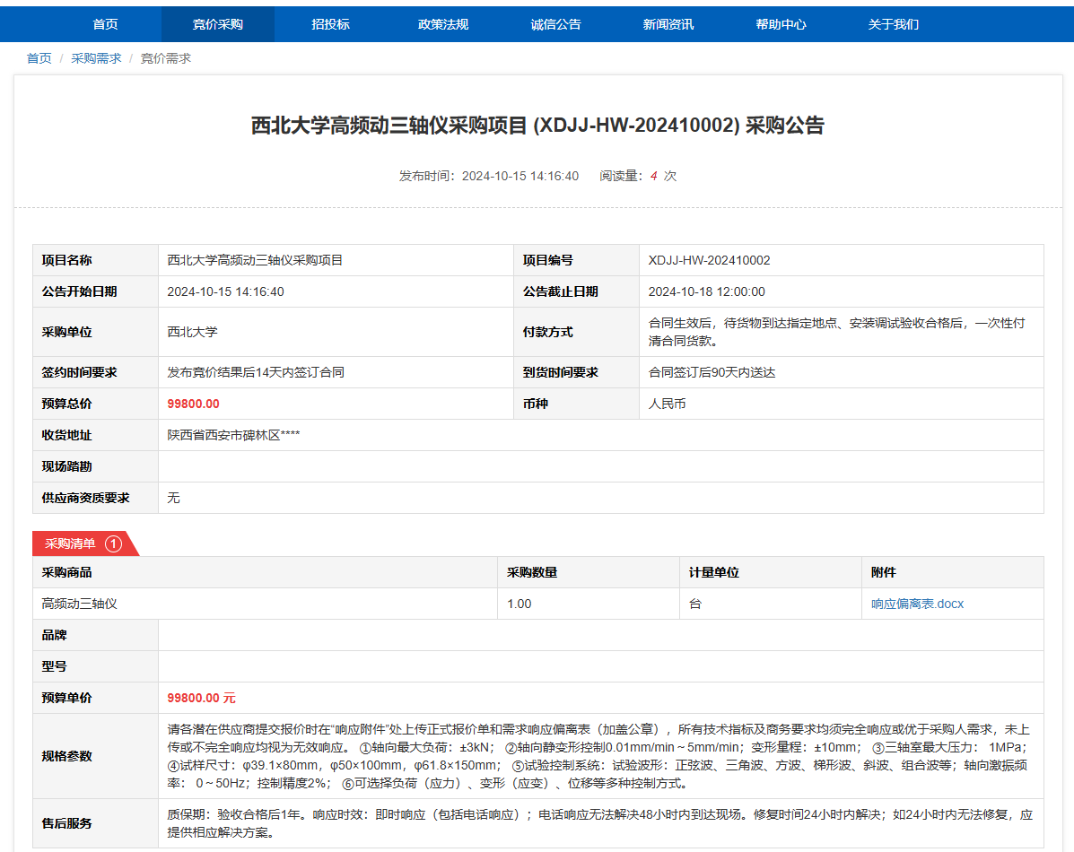 开云网页版登录入口高频动三轴仪采购项目(XDJJ-HW-202410002)竞价采购公告 作者:采购与招标办公室 编辑: 时间:2024-10-15 原公告链接:https://www.ejingcai.com.cn/site/bidding/detail/13317