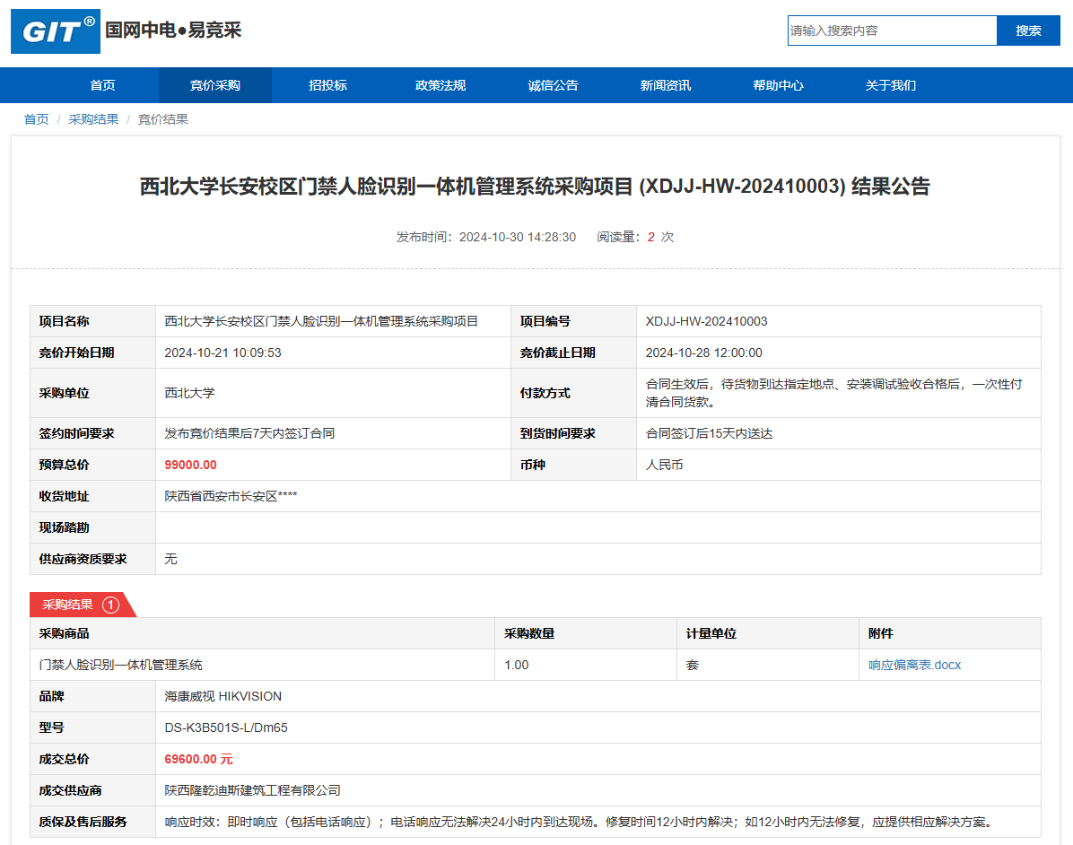 开云网页版登录入口长安校区门禁人脸识别一体机管理系统采购项目(XDJJ-HW-202410003)竞价结果公告 作者:采购与招标办公室 编辑: 时间:2024-10-30 原公告链接:https://www.ejingcai.com.cn/site/bidding/detail/14111