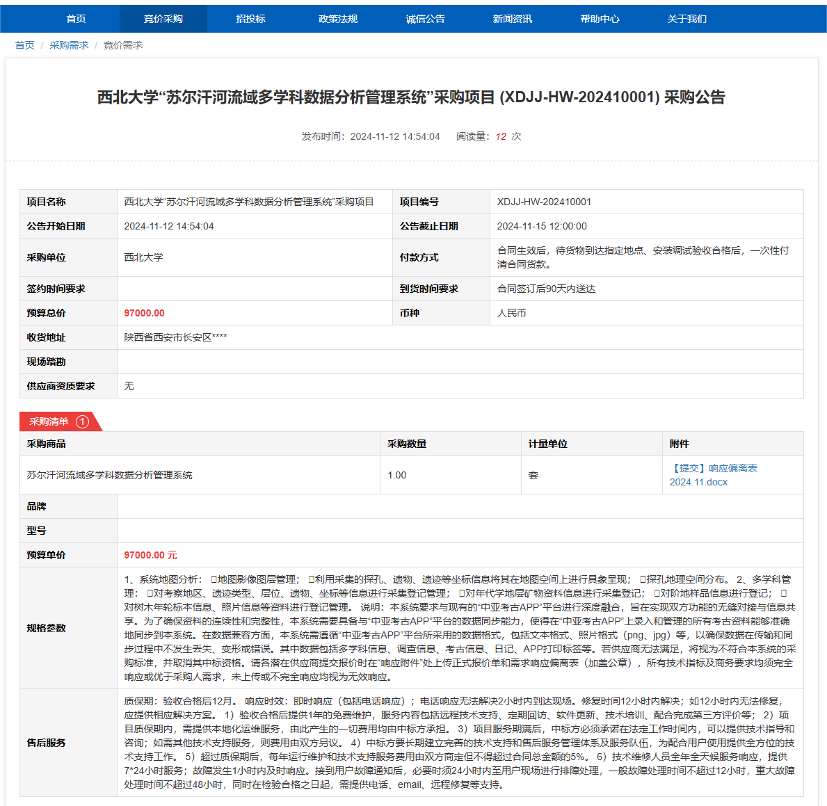开云网页版登录入口“苏尔汗河流域多学科数据分析管理系统”采购项目(XDJJ-HW-202410001)竞价采购公告 作者:采购与招标办公室 编辑: 时间:2024-11-12 原公告链接:https://www.ejingcai.com.cn/site/bidding/detail/14753