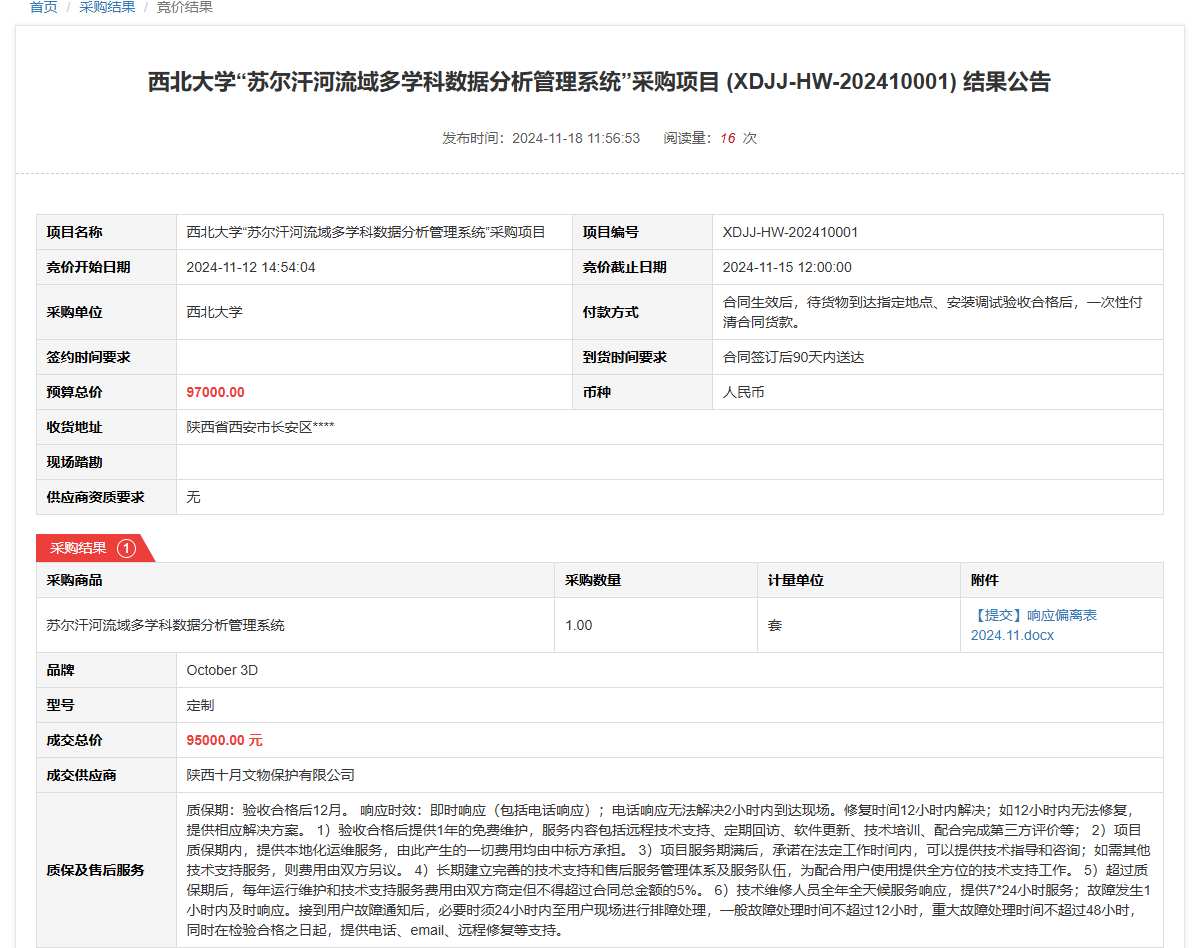 开云网页版登录入口“苏尔汗河流域多学科数据分析管理系统”采购项目(XDJJ-HW-202410001)竞价结果公告 作者:采购与招标办公室 编辑: 时间:2024-11-18 原公告链接:https://www.ejingcai.com.cn/site/bidding/detail/15008