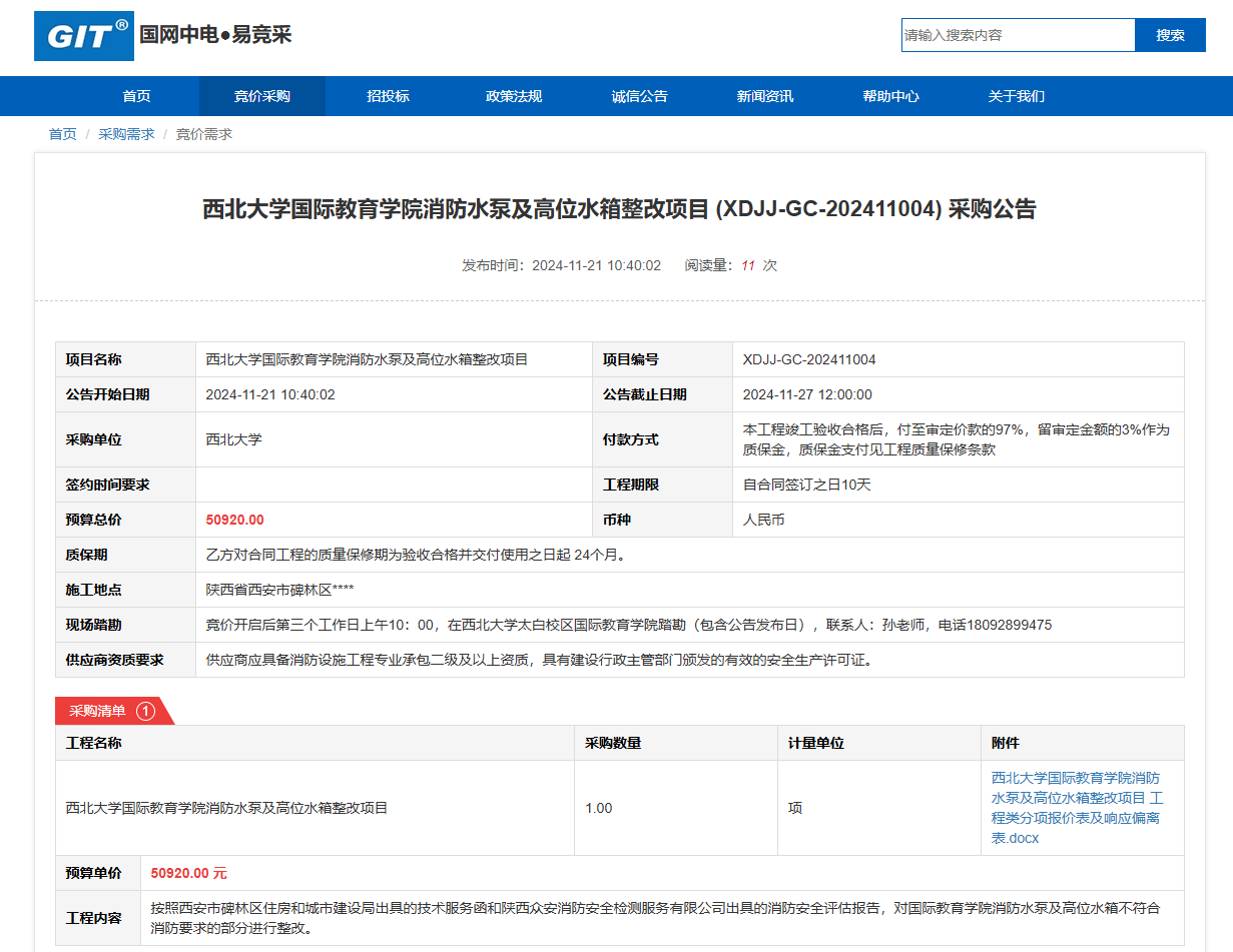 开云网页版登录入口国际教育学院消防水泵及高位水箱整改项目(XDJJ-GC-202411004)竞价采购公告 作者:采购与招标办公室 编辑: 时间:2024-11-21 原公告链接:https://www.ejingcai.com.cn/site/bidding/detail/15178