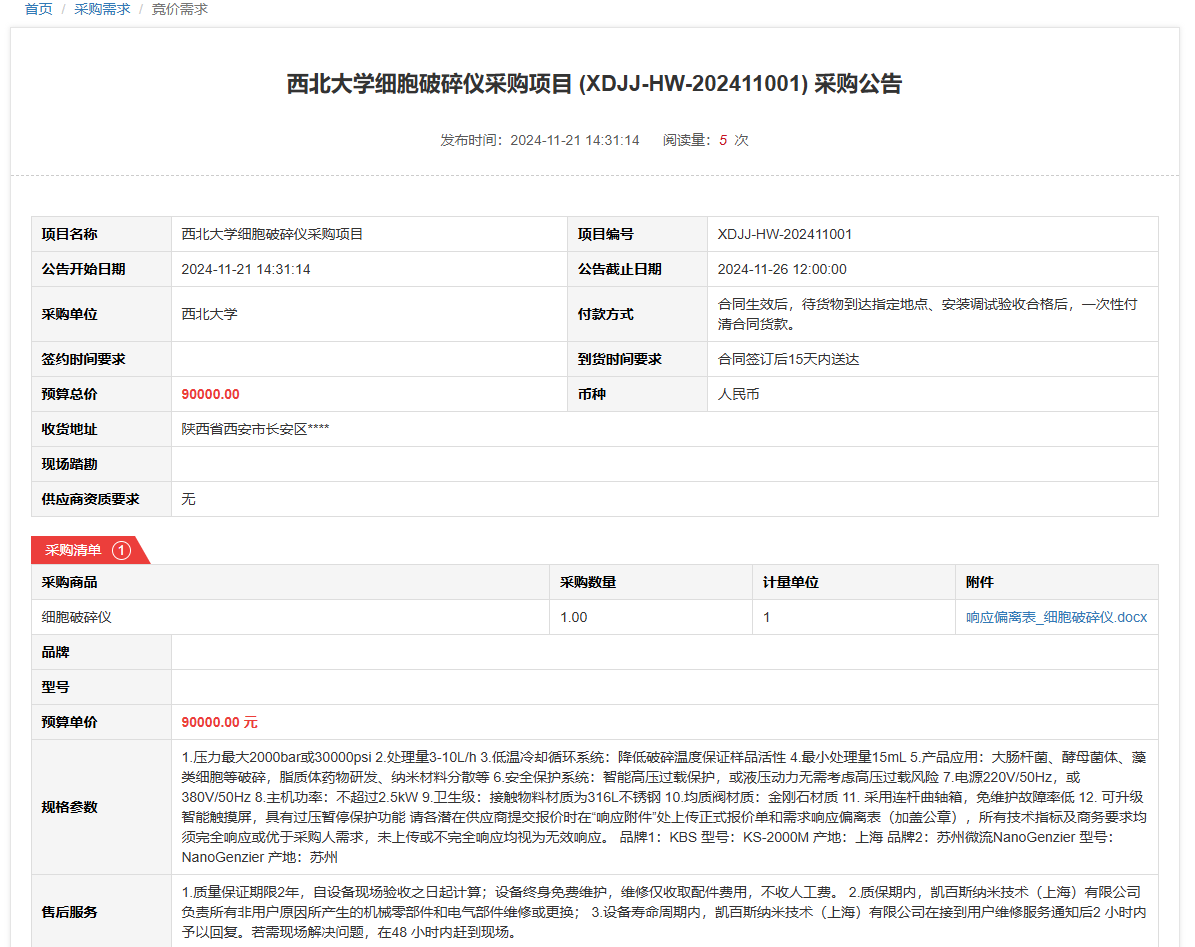 开云网页版登录入口细胞破碎仪采购项目(XDJJ-HW-202411001)竞价采购公告 作者:采购与招标办公室 编辑: 时间:2024-11-21 原公告链接:https://www.ejingcai.com.cn/site/bidding/detail/15200
