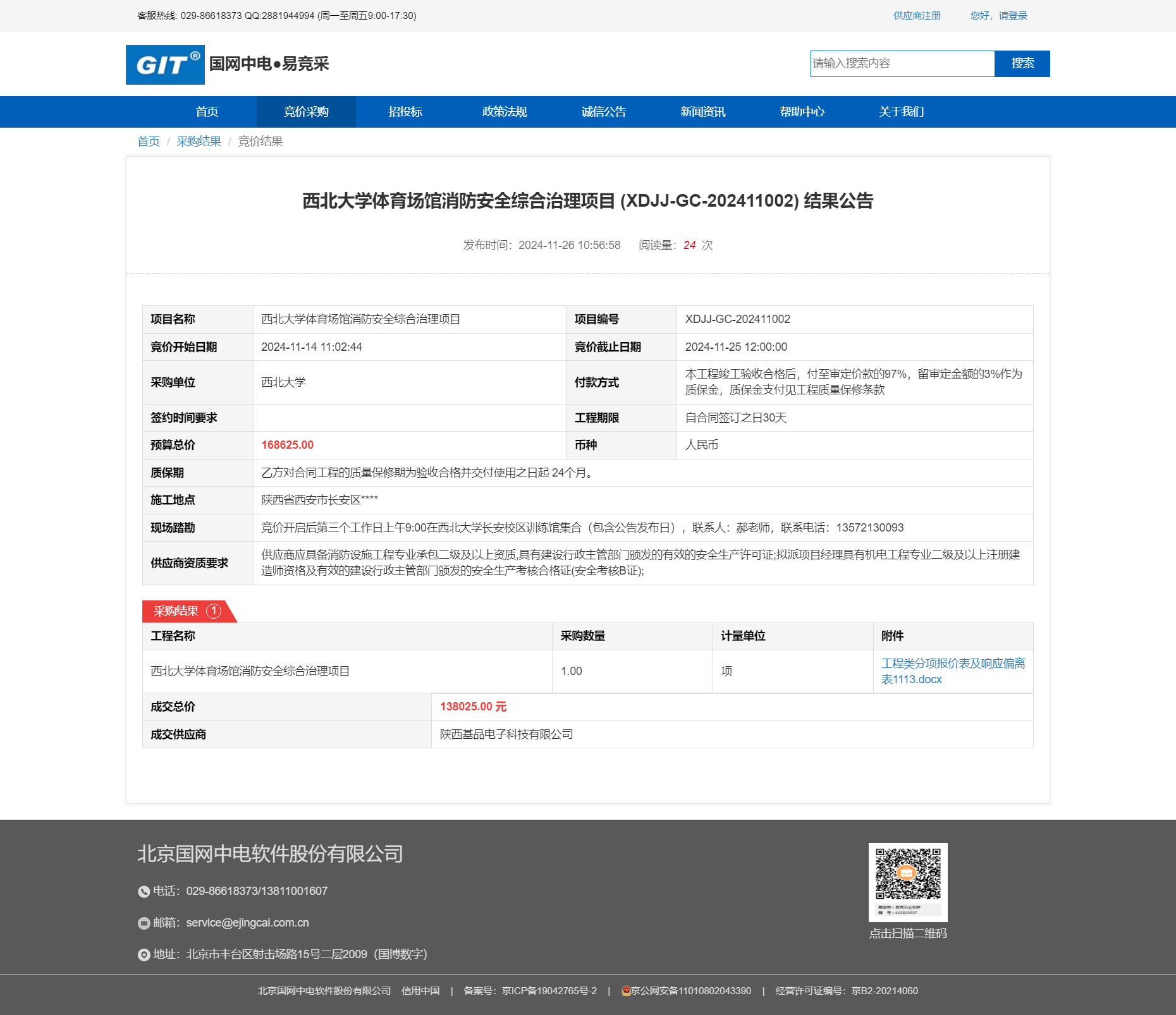 开云网页版登录入口体育场馆消防安全综合治理项目 (XDJJ-GC-202411002) 结果公告