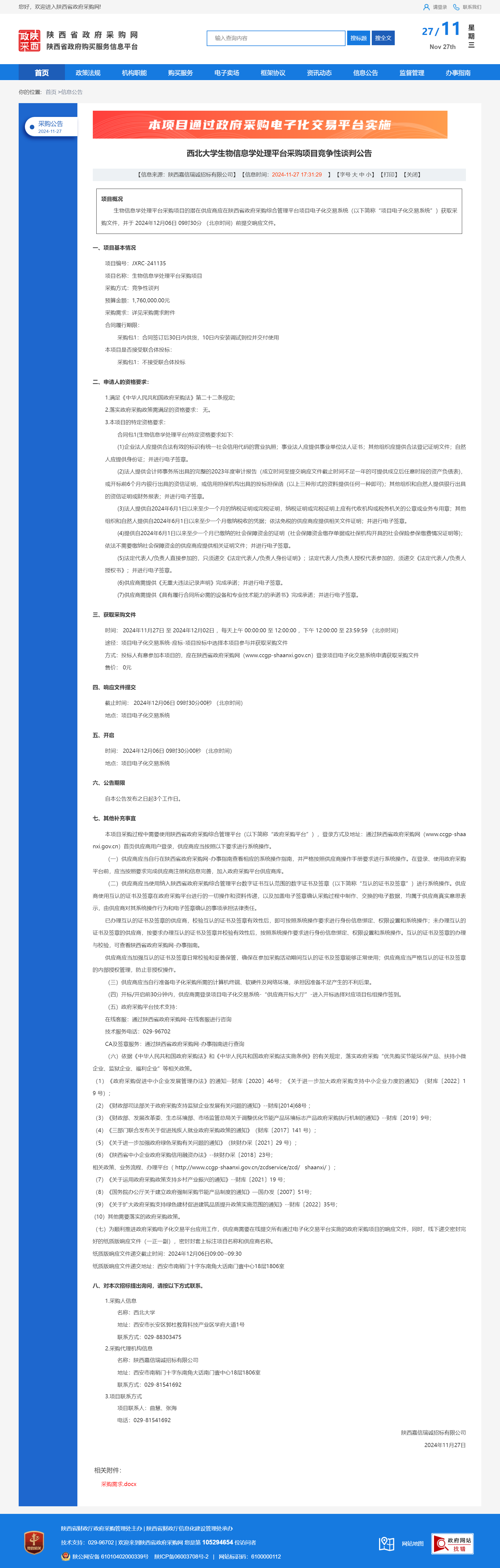 开云网页版登录入口生物信息学处理平台采购项目竞争性谈判公告 作者:采购与招标办公室 编辑: 时间:2024-11-27 原公告链接:https://www.ccgp-shaanxi.gov.cn/freecms/site/shaanxi/ggxx/info/2024/8a69c2519218573701936ce159174448.html?noticeType=001013¬iceId=f93e2324-aca3-11ef-8063-08c0eb20c666