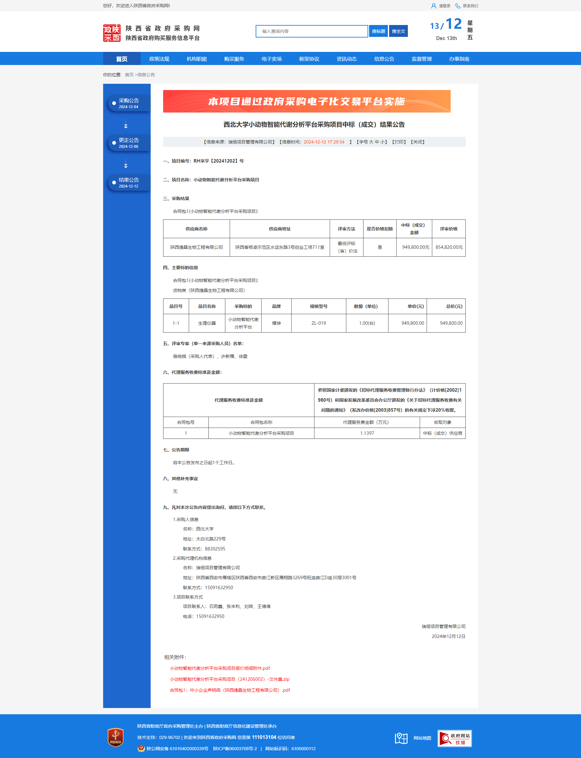 开云网页版登录入口小动物智能代谢分析平台采购项目中标(成交)结果公告