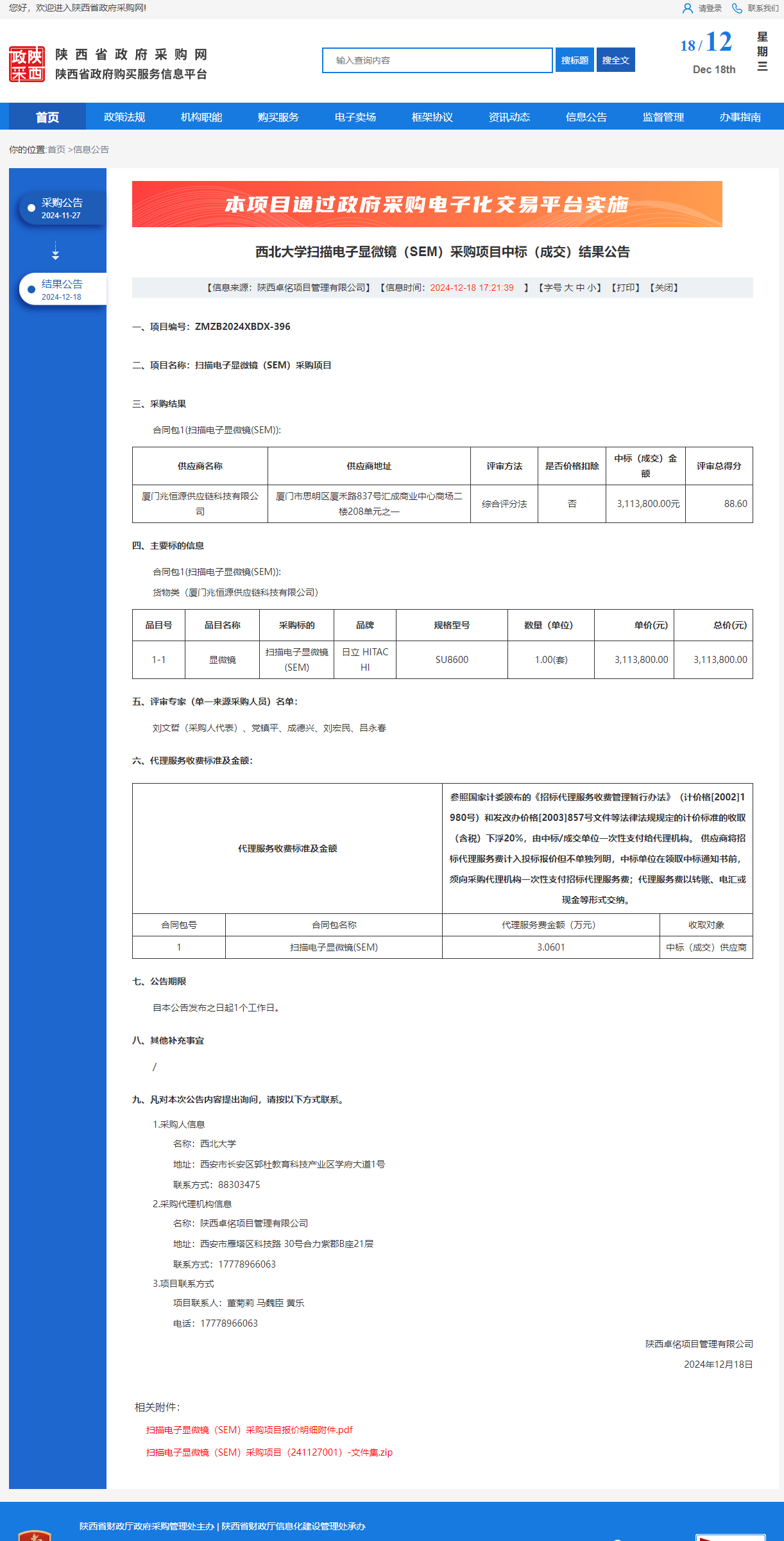开云网页版登录入口扫描电子显微镜(SEM)采购项目中标(成交)结果公告 作者:采购与招标办公室 编辑: 时间:2024-12-18 原公告链接:https://www.ccgp-shaanxi.gov.cn/freecms/site/shaanxi/ggxx/info/2024/8a69c95d921859f00193d90183470ad8.html?noticeType=001021¬iceId=1e709926-bd23-11ef-8063-08c0eb20c666