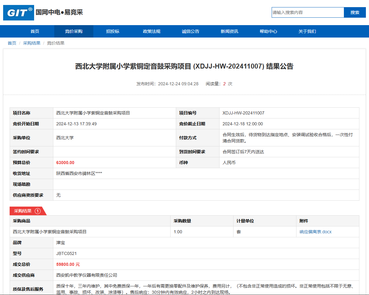 开云网页版登录入口附属小学紫铜定音鼓采购项目(XDJJ-HW-202411007)竞价结果公告 作者:采购与招标办公室 编辑: 时间:2024-12-24 原公告链接:https://www.ejingcai.com.cn/site/bidding/detail/16145