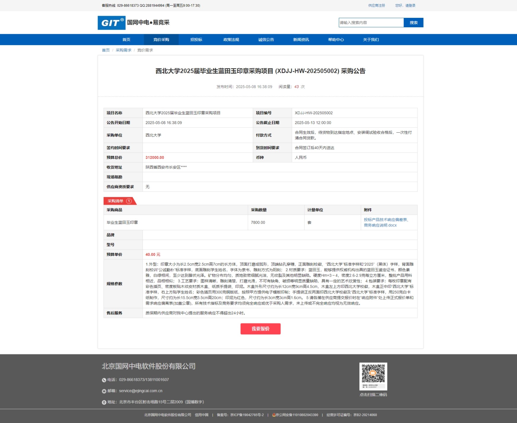 开云网页版登录入口2025届毕业生蓝田玉印章采购项目 (XDJJ-HW-202505002) 竞价采购公告