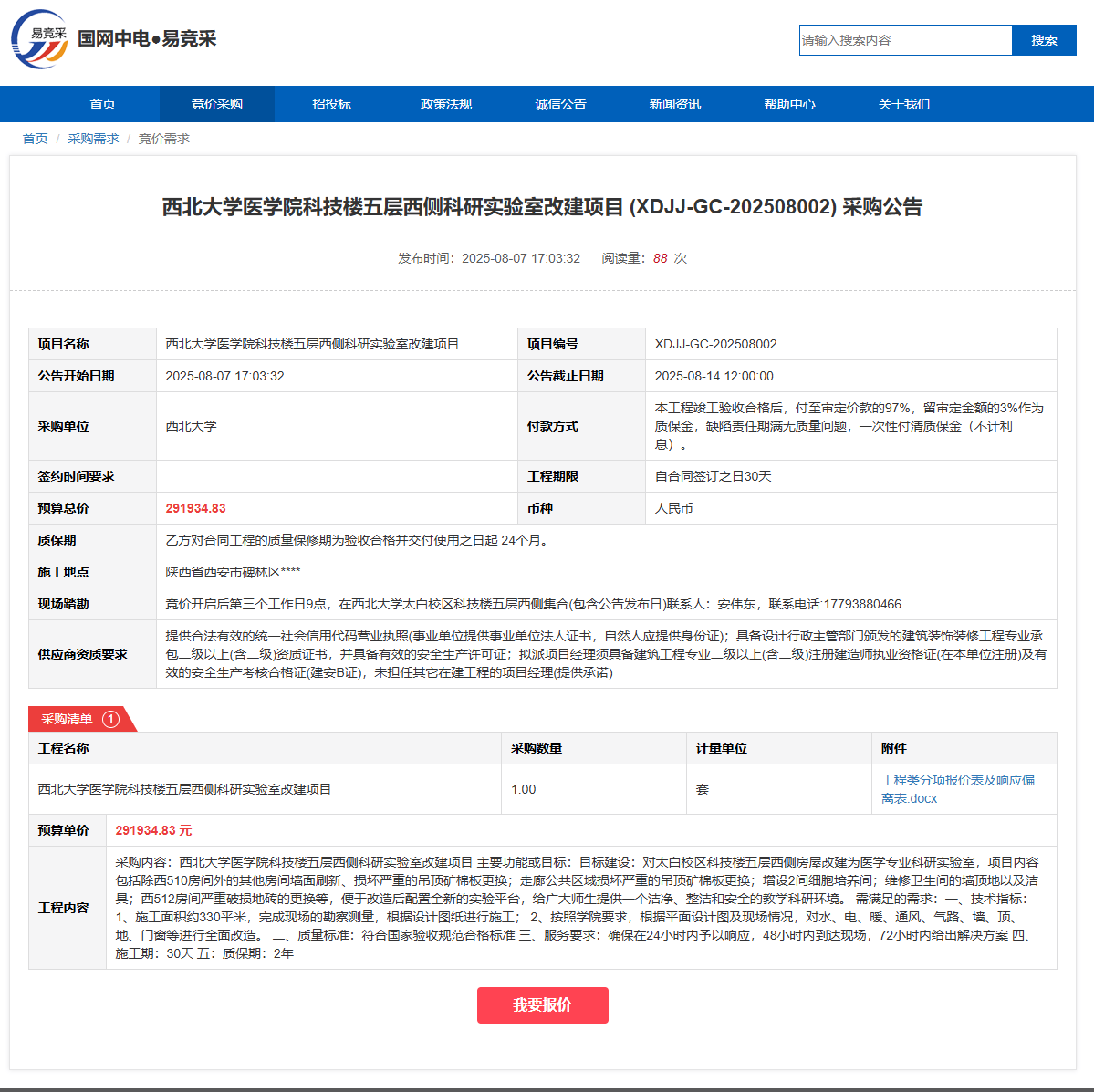 开云网页版登录入口医学院科技楼五层西侧科研实验室改建项目 (XDJJ-GC-202508002) 采购公告 作者: 编辑:党丹珩 时间:2025-08-08 公告地址:https://www.ejingcai.com.cn/site/bidding/detail/19914