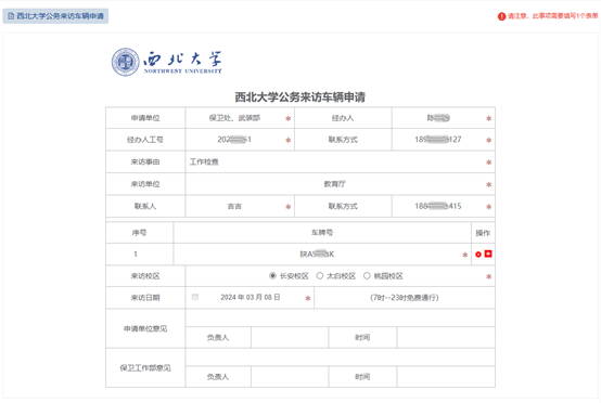 2.提交申请后由经办人所在单位领导(机关处室主要负责人、院系行政副院长)负责一级审批,保卫处三校区治安工作负责人负责所在校区公务来访车辆的二级审批。