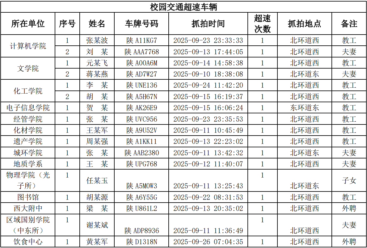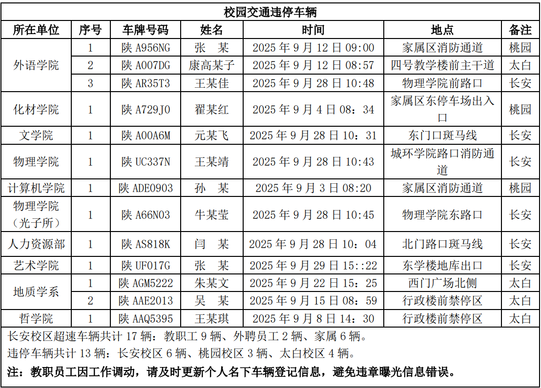为进一步加强校园交通管理,保障校园交通安全有序,维护学校正常的教学、科研和生活秩序,切实保护师生员工的人身财产安全,根据《开云网页版登录入口校园交通安全管理规定》的相关要求,现将2025年9月校园交通违章车辆予以曝光,具体要求与违章信息如下: