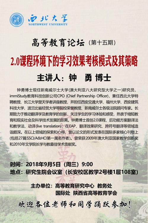 开云网页版登录入口"高等教育论坛"(第十五期) 作者: 编辑: 时间:2018-09-03 16:59 校内各有关单位: “高等教育论坛”第十五期即将举行,现将具体情况通知如下: 讲座题目:2.0课程环境下的学习效果考核模式及其策略主讲嘉宾:钟 勇 博士讲座时间:2018年9月5日(周三)上午9:00讲座地点:研究生院会议室(长安校区教学2号楼1层108室)主办单位:高等教育研究中心、教务处、国际处、陕西省高等教育学会欢迎各位老师和同学踊跃参加!窗体顶端联系人:伍小东 13891830894
