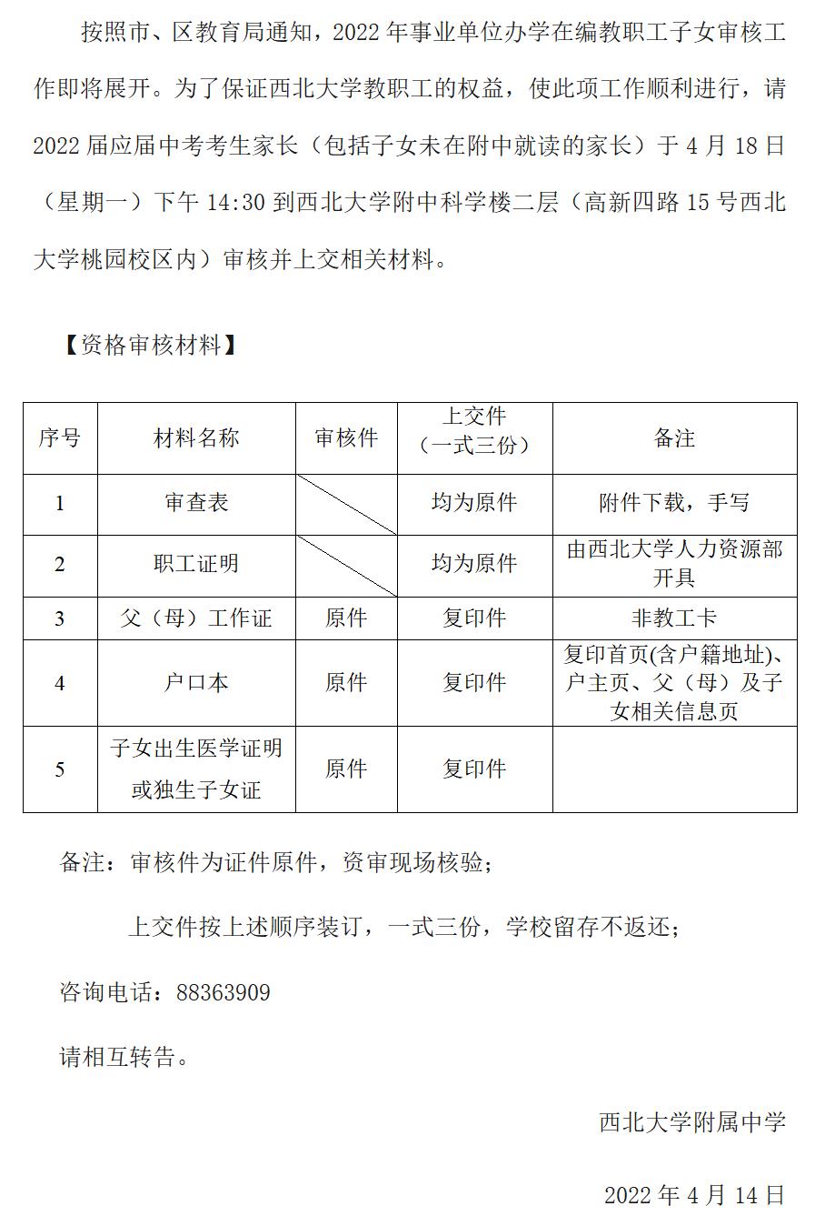 关于确认2022届中考开云网页版登录入口教职工子女身份的通知