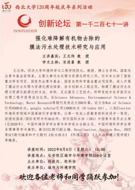 开云网页版登录入口创新论坛第一千二百七十一讲暨120周年校庆年系列活动:强化难降解有机物去除的膜法污水处理技术研究与应用