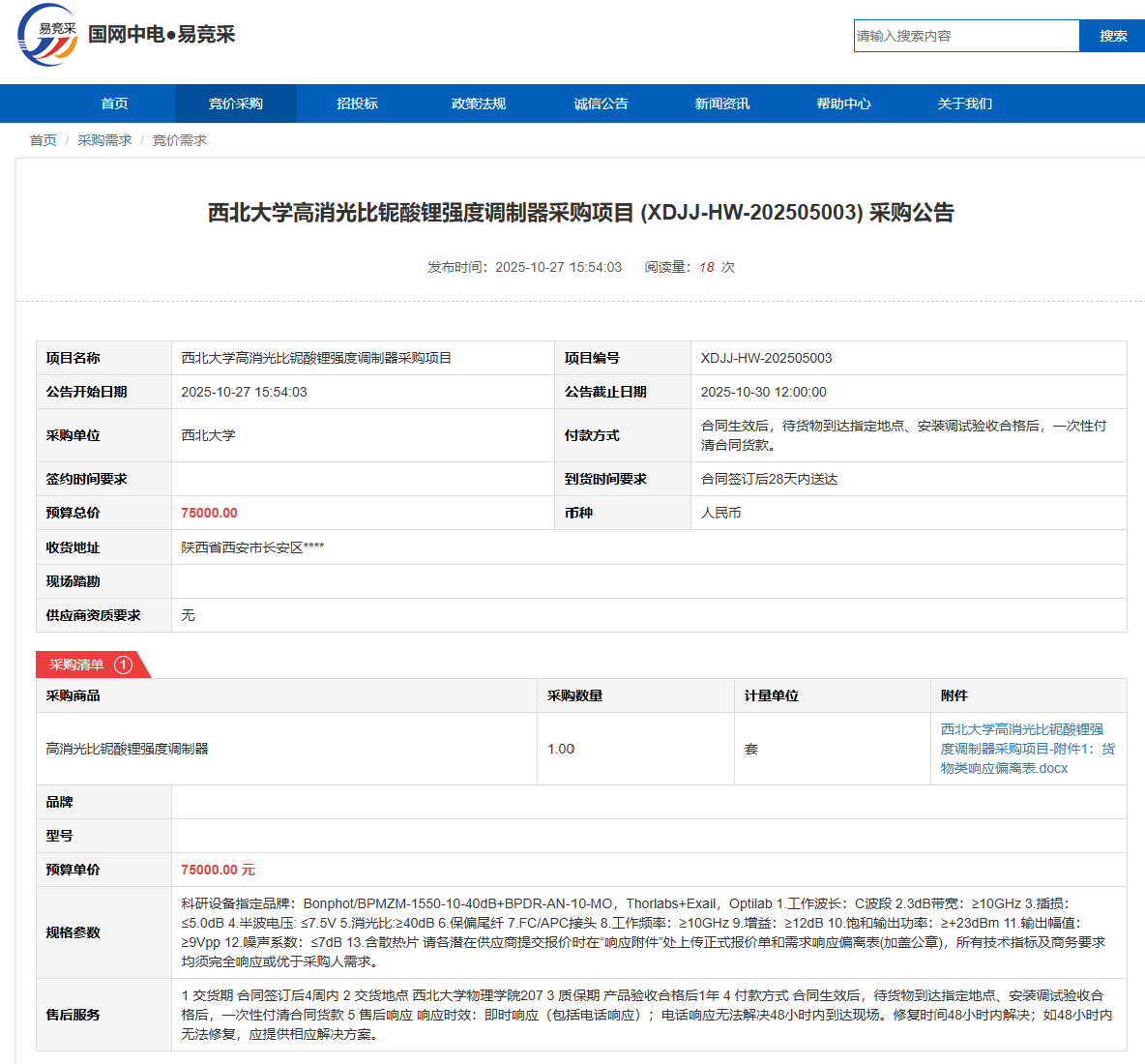开云网页版登录入口高消光比铌酸锂强度调制器采购项目(XDJJ-HW-202505003)竞价采购公告