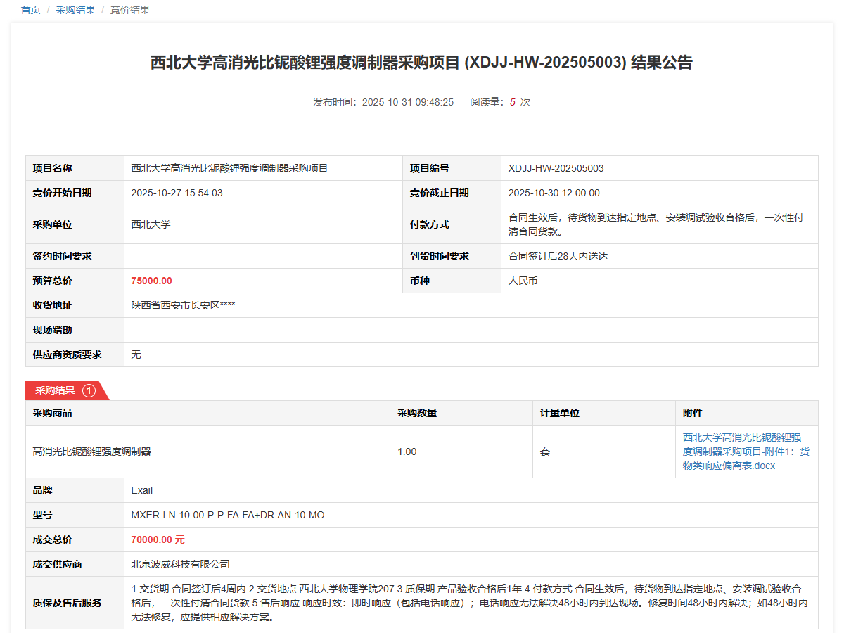 开云网页版登录入口高消光比铌酸锂强度调制器采购项目(XDJJ-HW-202505003)竞价结果公告