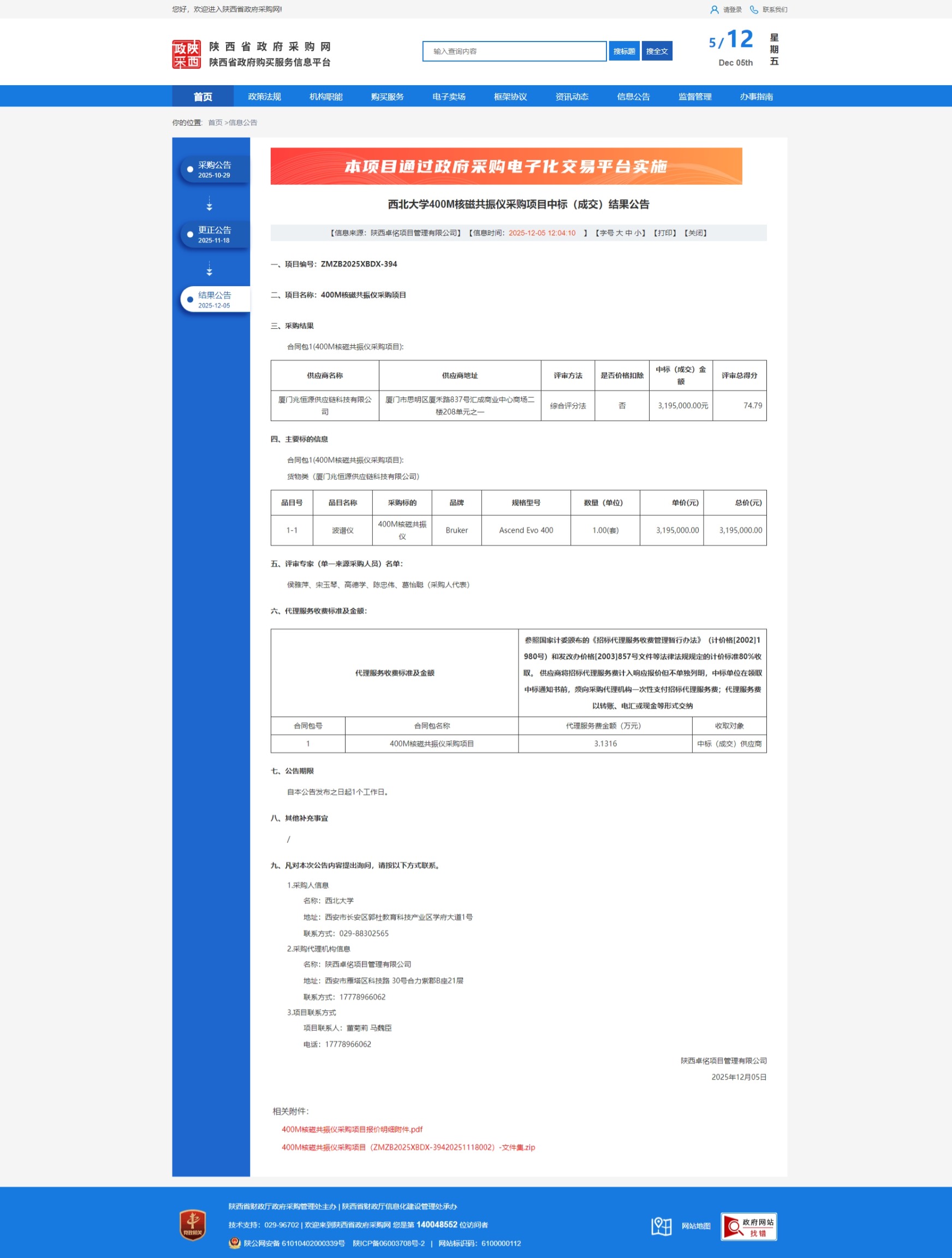 开云网页版登录入口400M核磁共振仪采购项目中标(成交)结果公告 作者: 编辑:国有资产管理处 时间:2025-12-05 原公告链接:https://www.ccgp-shaanxi.gov.cn/freecms/site/shaanxi/ggxx/info/2025/8a69c7609a63685e019aec6e950138e4.html?noticeType=001021¬iceId=b64f5901-d191-11f0-8063-08c0eb20c666