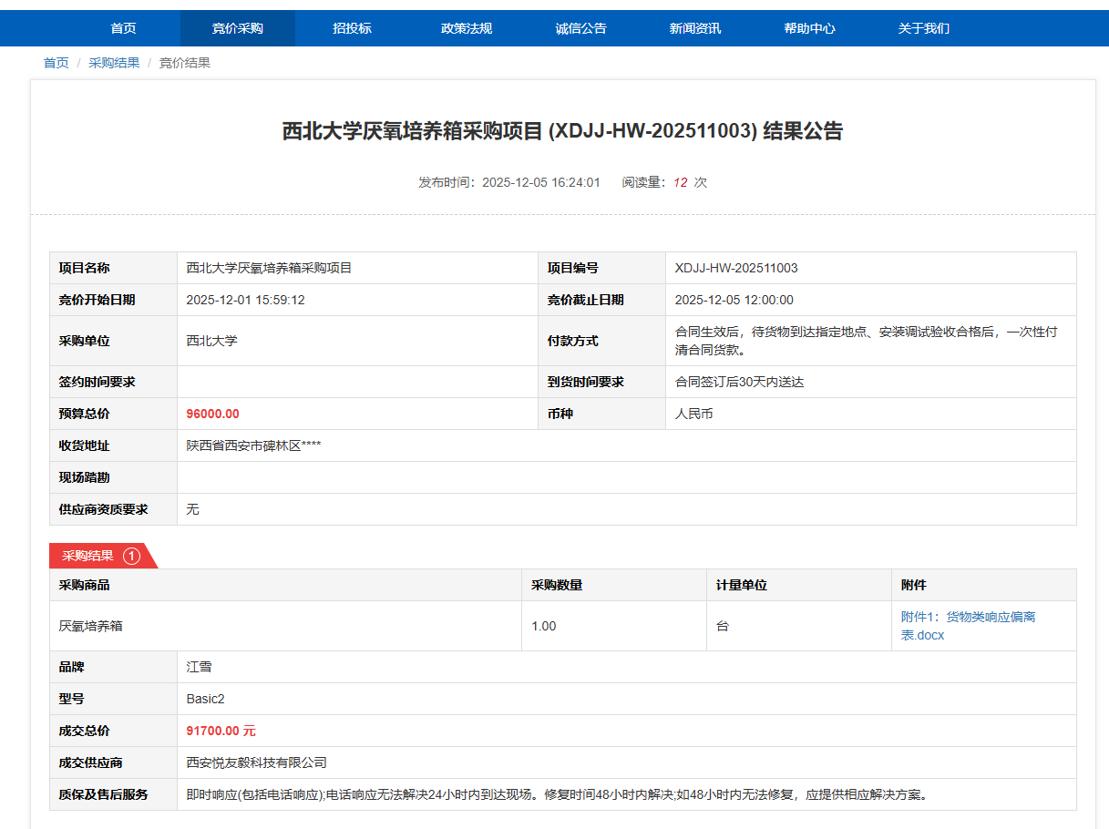 开云网页版登录入口厌氧培养箱采购项目(XDJJ-HW-202511003)竞价结果公告