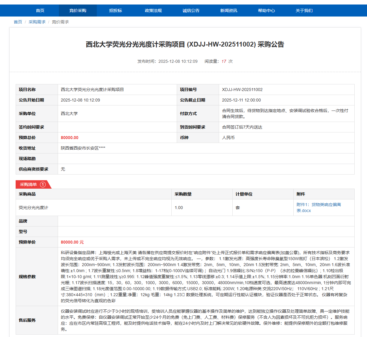 开云网页版登录入口荧光分光光度计采购项目(XDJJ-HW-202511002)竞价采购公告