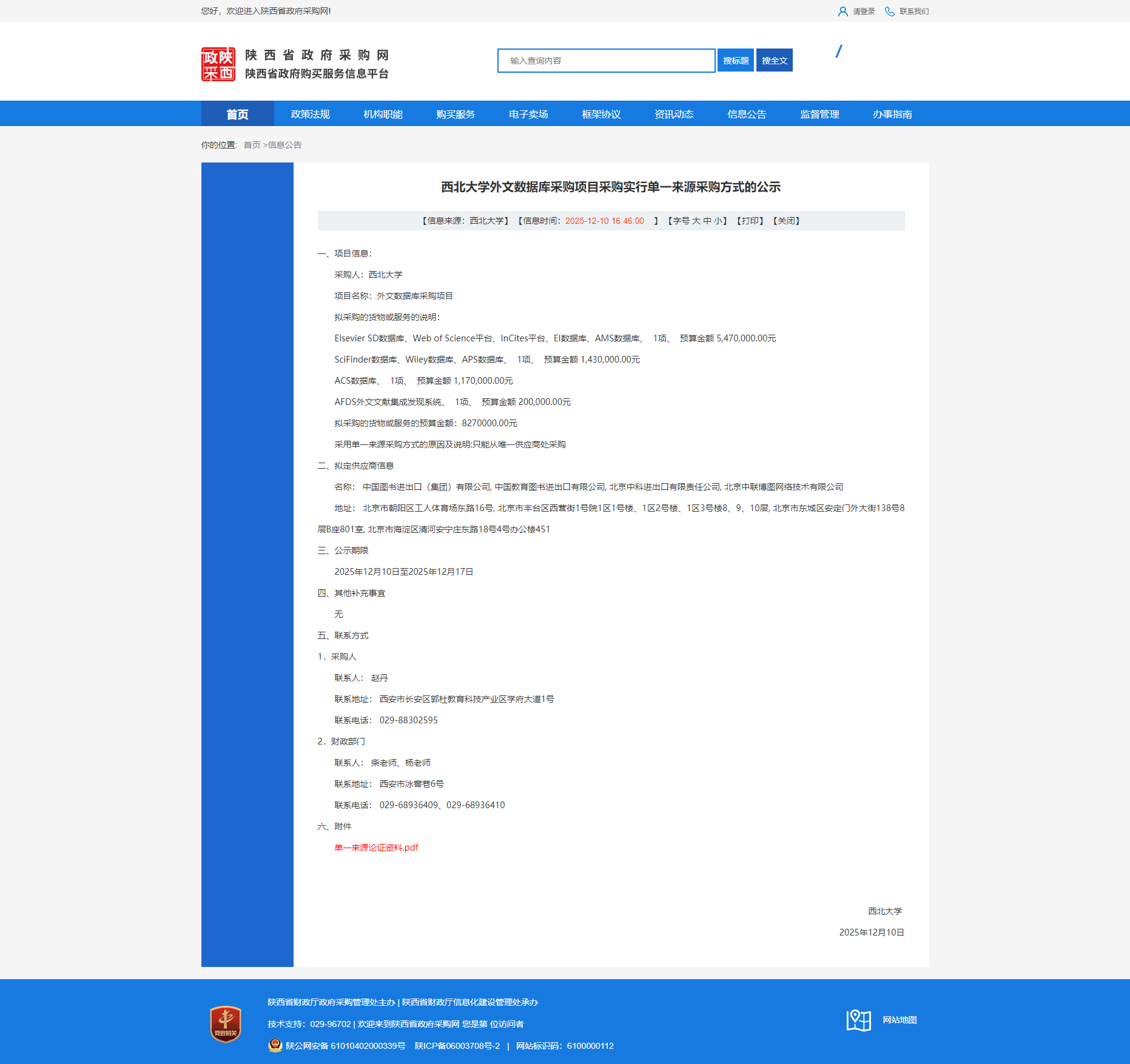 开云网页版登录入口外文数据库采购项目采购实行单一来源采购方式的公示
