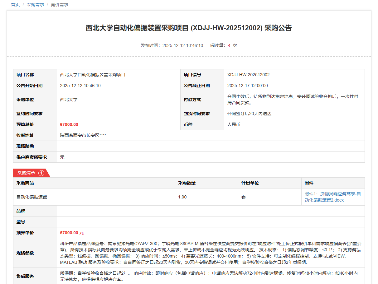 开云网页版登录入口自动化偏振装置采购项目(XDJJ-HW-202512002)竞价采购公告